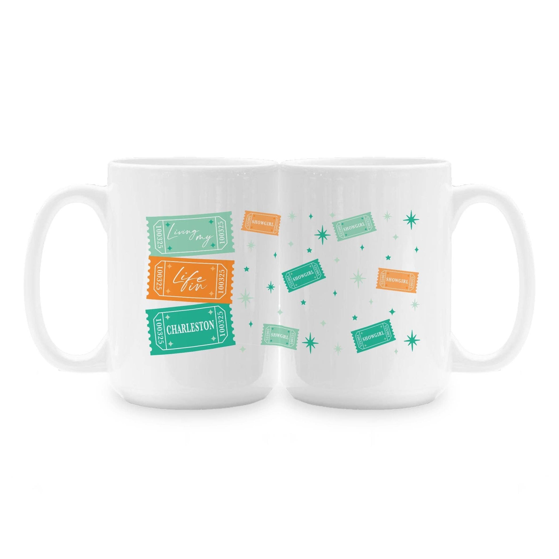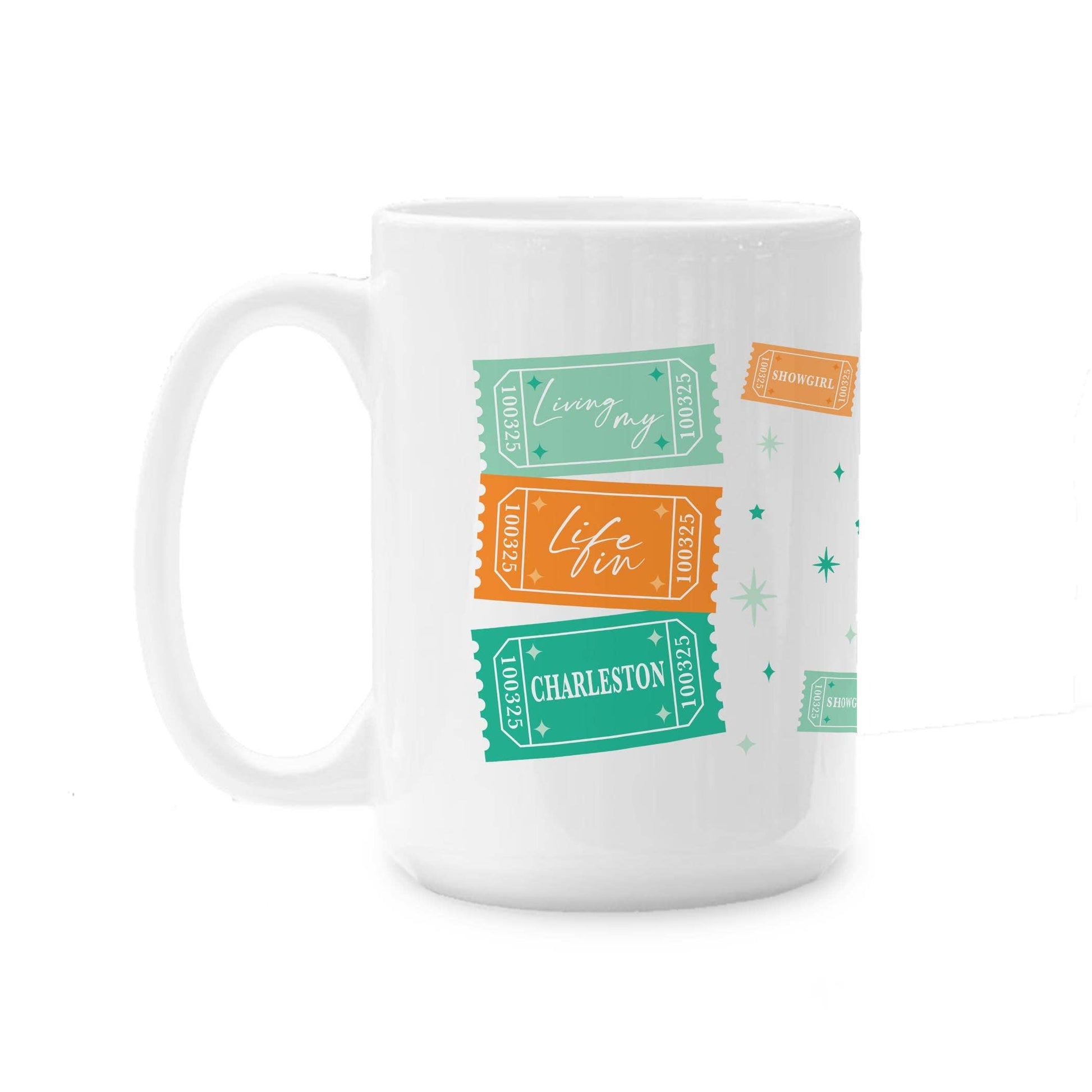 Crafted from durable ceramic, this generously sized mug is not only functional but also beautifully designed to brighten your day. Adorned with colorful motifs reminiscent of vintage show tickets and starbursts, it invites a sense of nostalgia while making every morning ritual feel special. Perfect for savoring your favorite brew, it combines comfort and style—ideal for those cozy moments spent with family or friends.