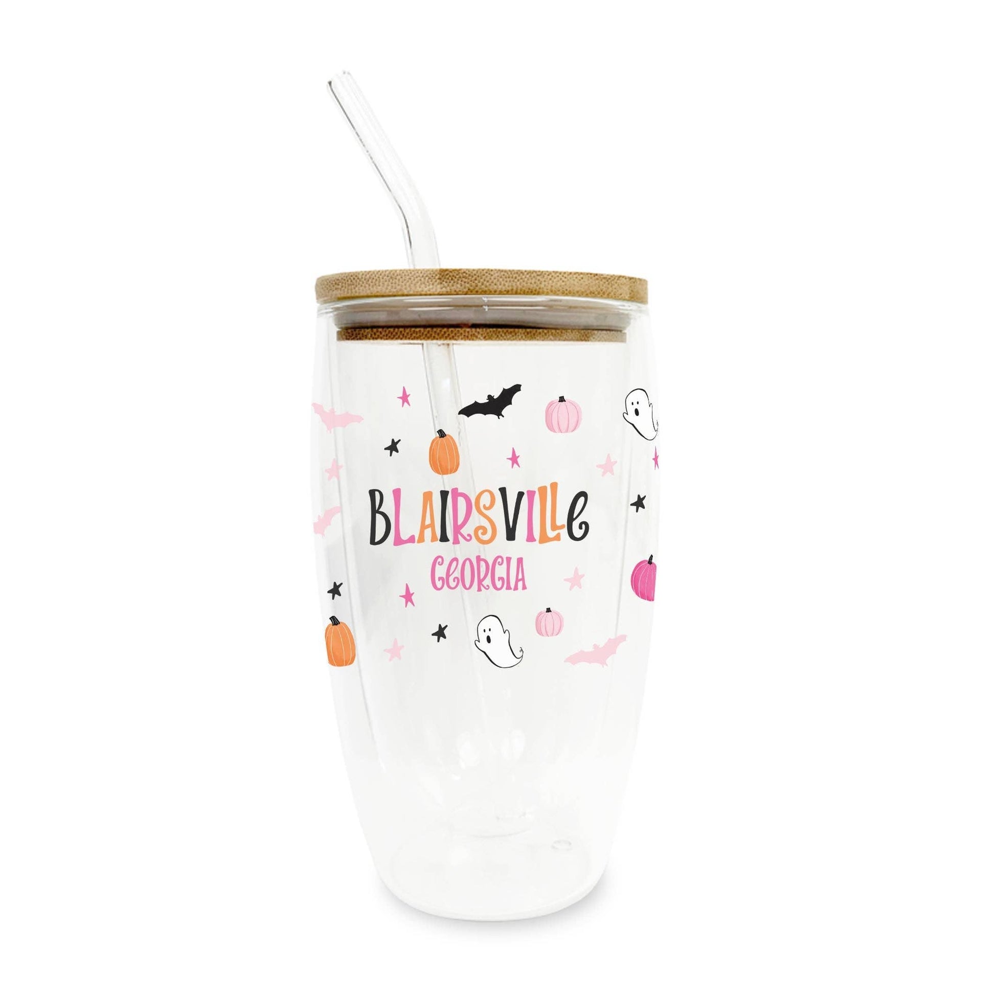 Celebrate the spirit of Blairsville, Georgia, with our delightful 16oz Custom Insulated Glass Tumbler, adorned with whimsical Halloween motifs. This tumbler captures the charm of our small town with its enchanting design featuring playful ghosts, charming pumpkins, and festive bats, making it a perfect addition to your seasonal offerings. Customers will love sipping their favorite chilled beverages while embracing the warm, neighborly vibes of Halloween.