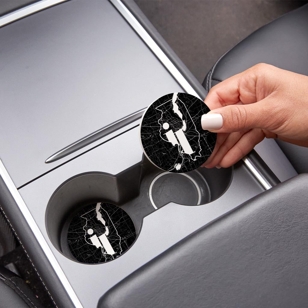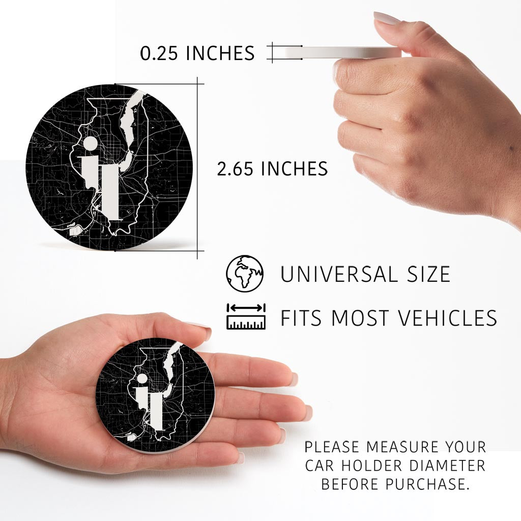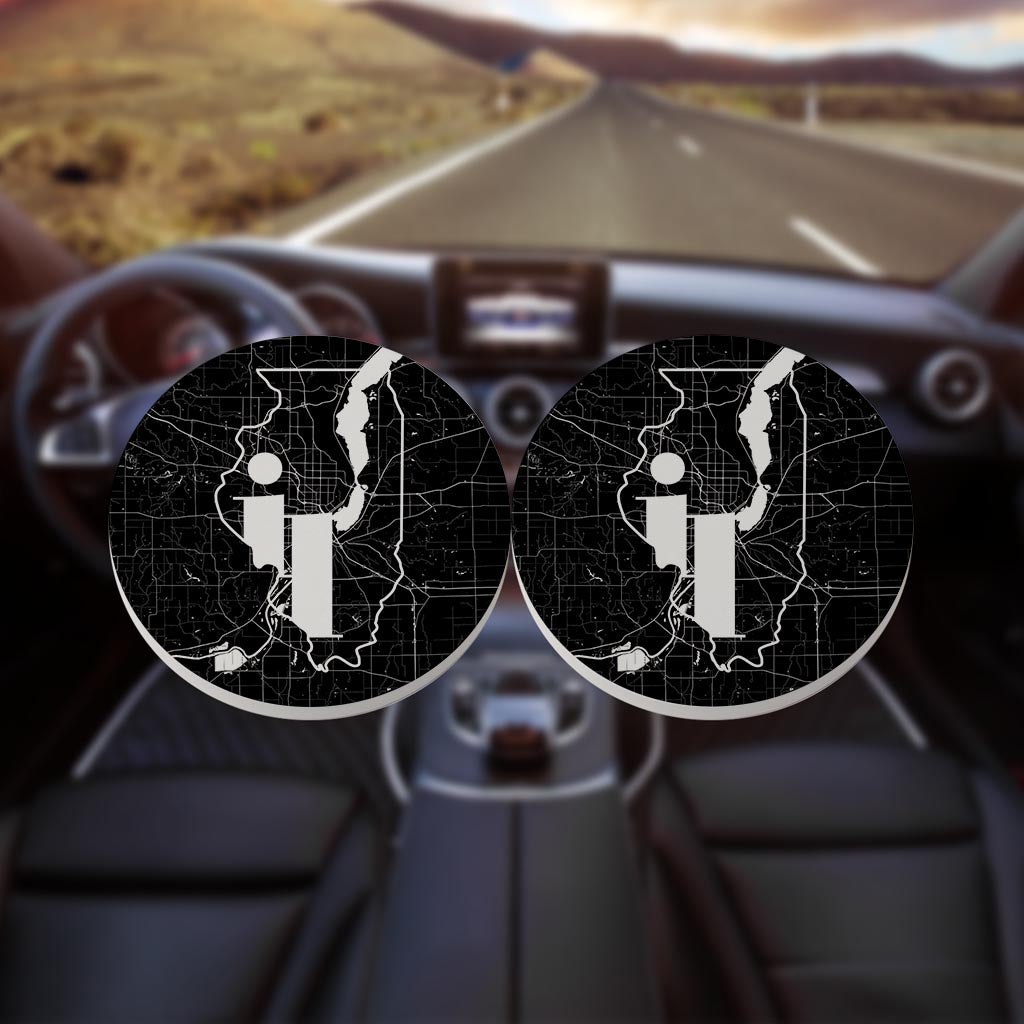 Black And White Abbreviated State Map Black Illinois Peoria| Absorbent Car Coasters | Set of 2 | Min 4
