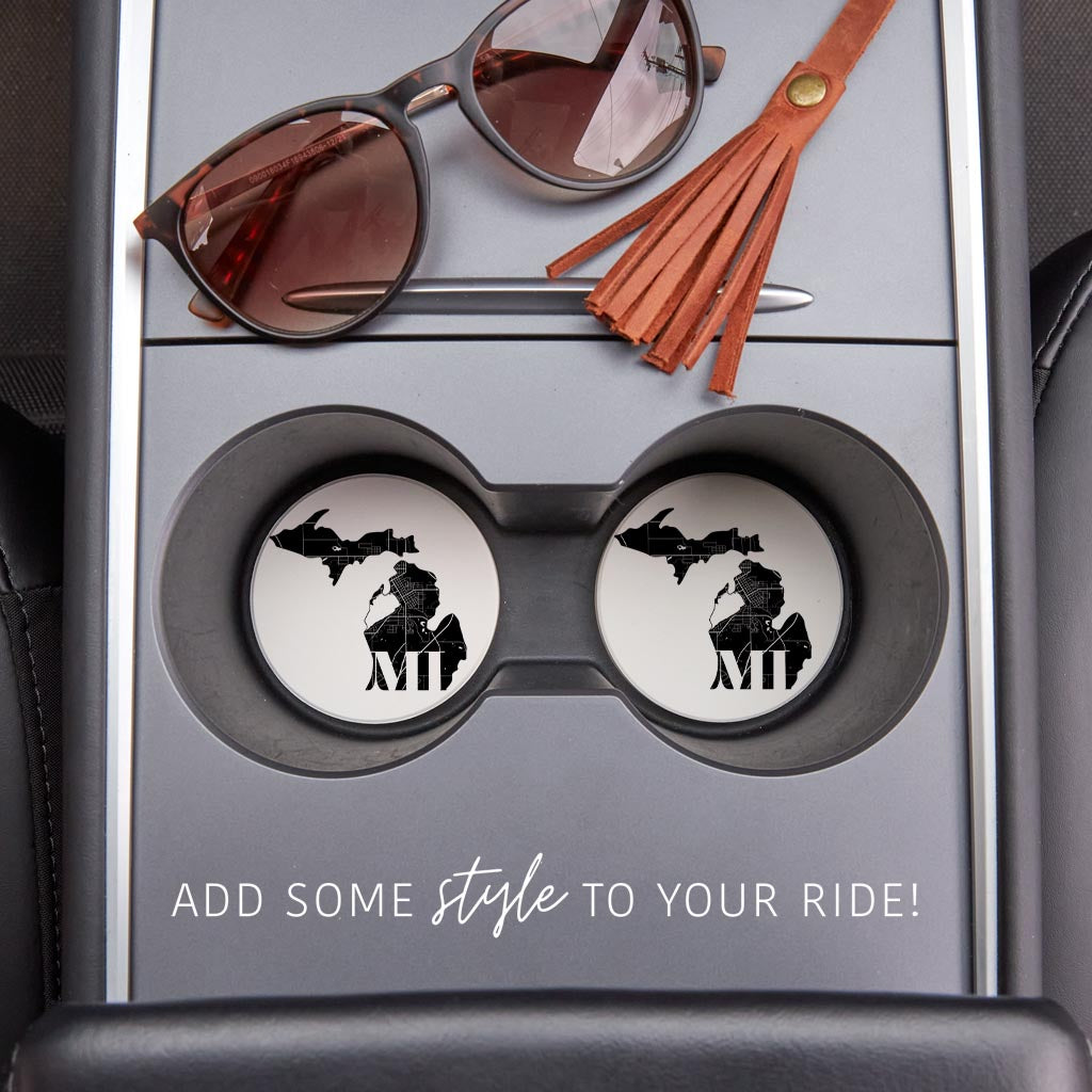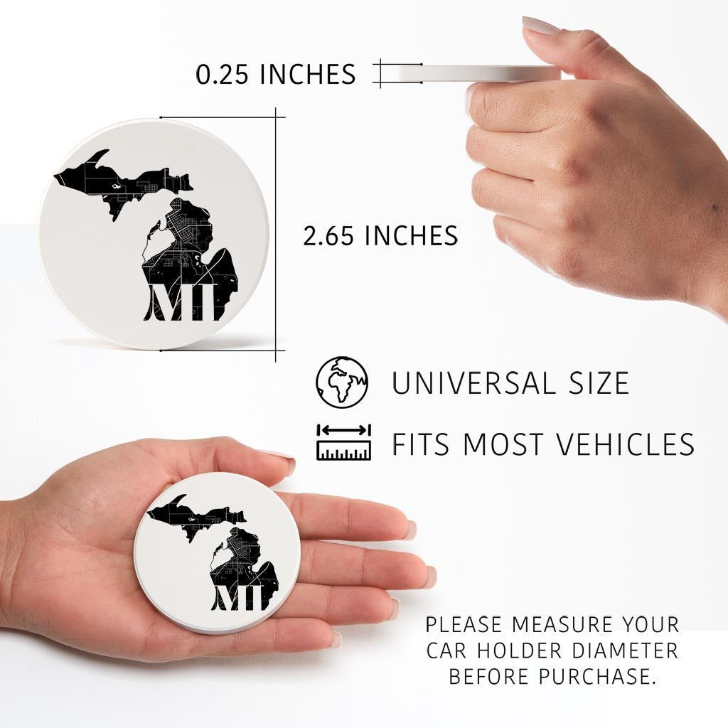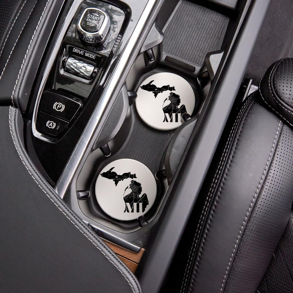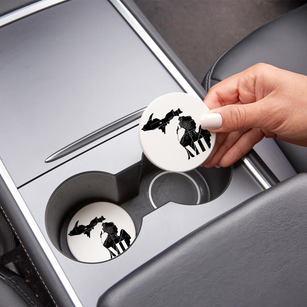 Black And White Abbreviated State Map White Michigan| Absorbent Car Coasters | Set of 2 | Min 4