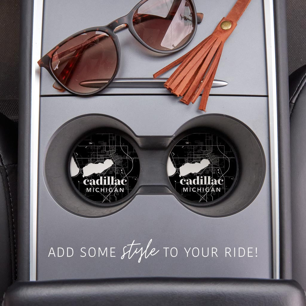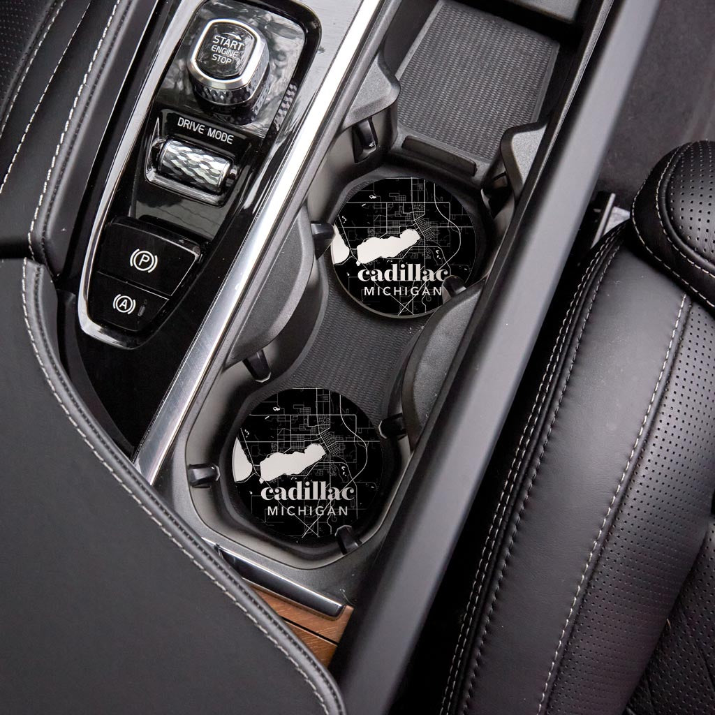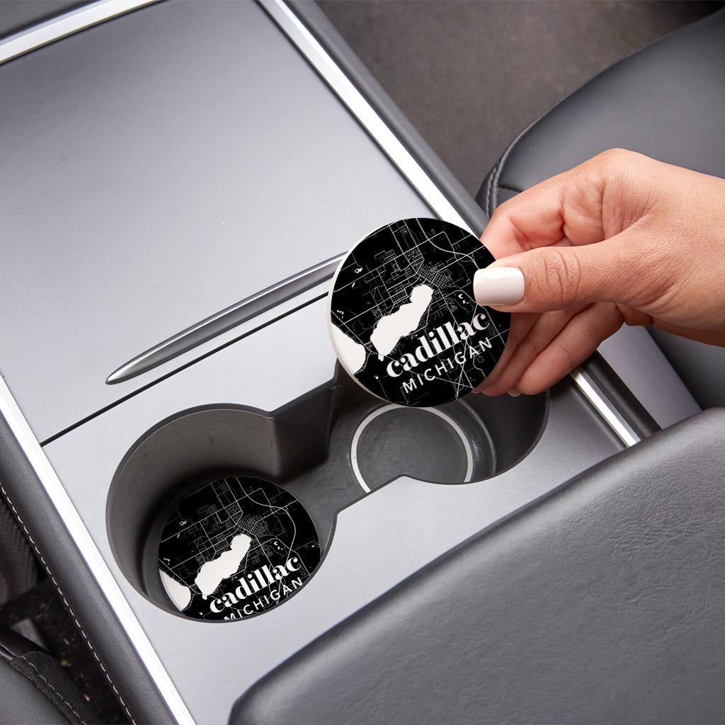 Black And White Black Map Michigan Cadillac| Absorbent Car Coasters | Set of 2 | Min 4