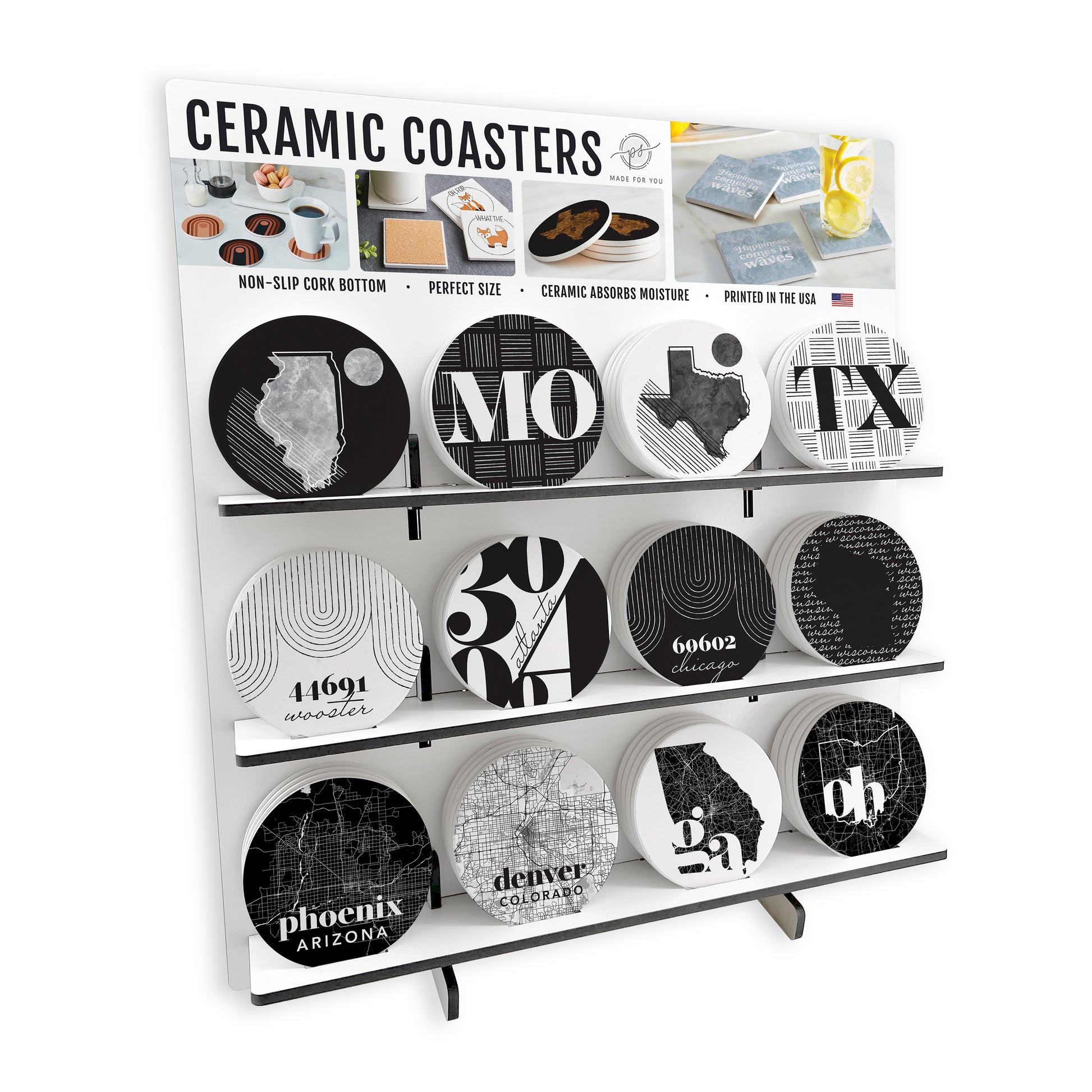 Coaster Point of Purchase Display containing 4 each of 12 designs. Quick and easy assembly and sturdy enough to move from location to location. Display measures 10.5 x 18.5 x 20in using minimal space. Easy reorders with low minimums.