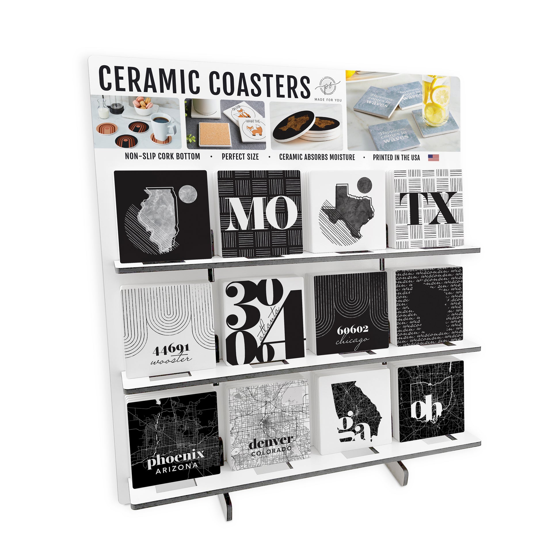 Coaster Point of Purchase Display containing 4 each of 12 designs. Quick and easy assembly and sturdy enough to move from location to location. Display measures 10.5 x 18.5 x 20in using minimal space. Easy reorders with low minimums.