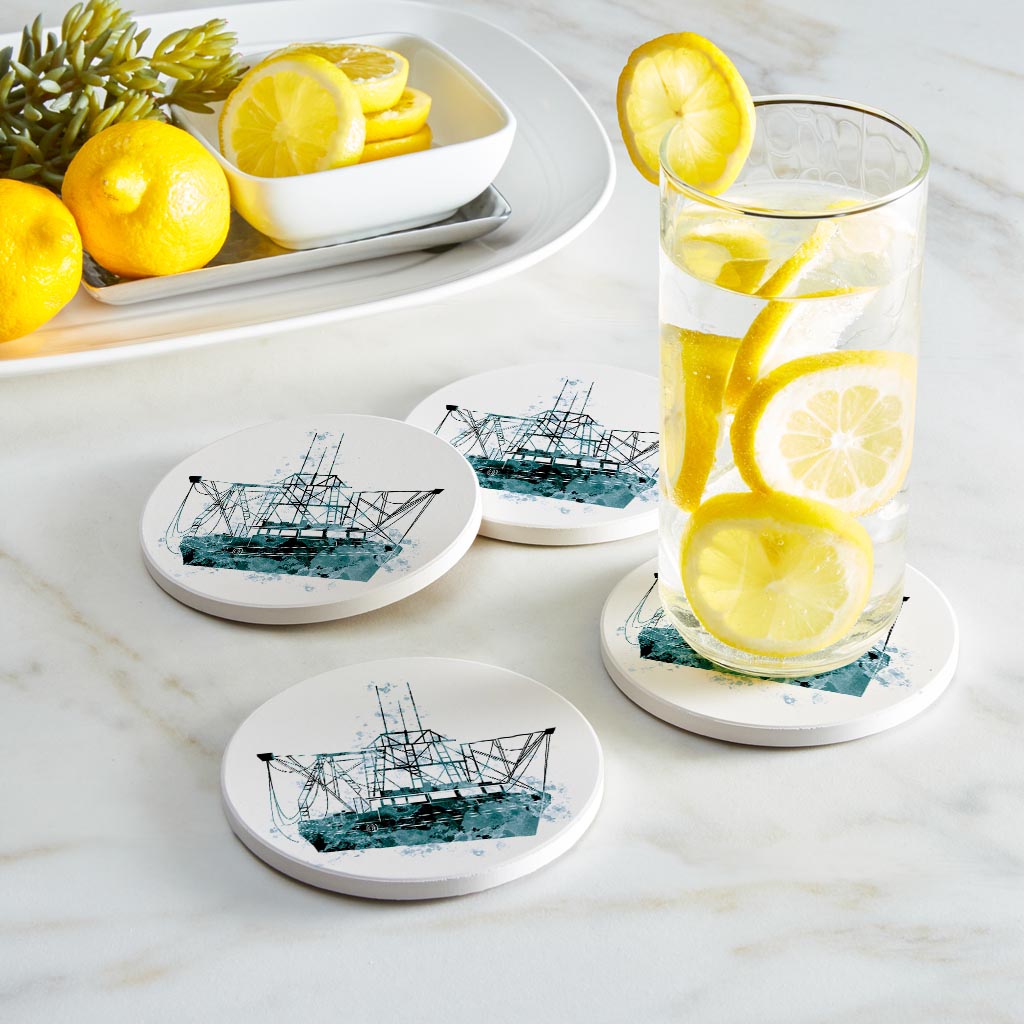 Blue White Water Color Shrimp Boat | Absorbent Coasters | Set of 4 | Min 2