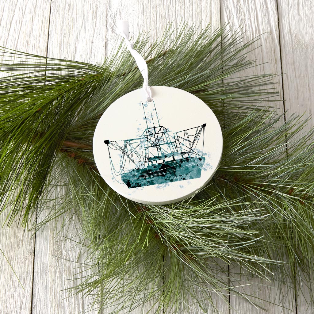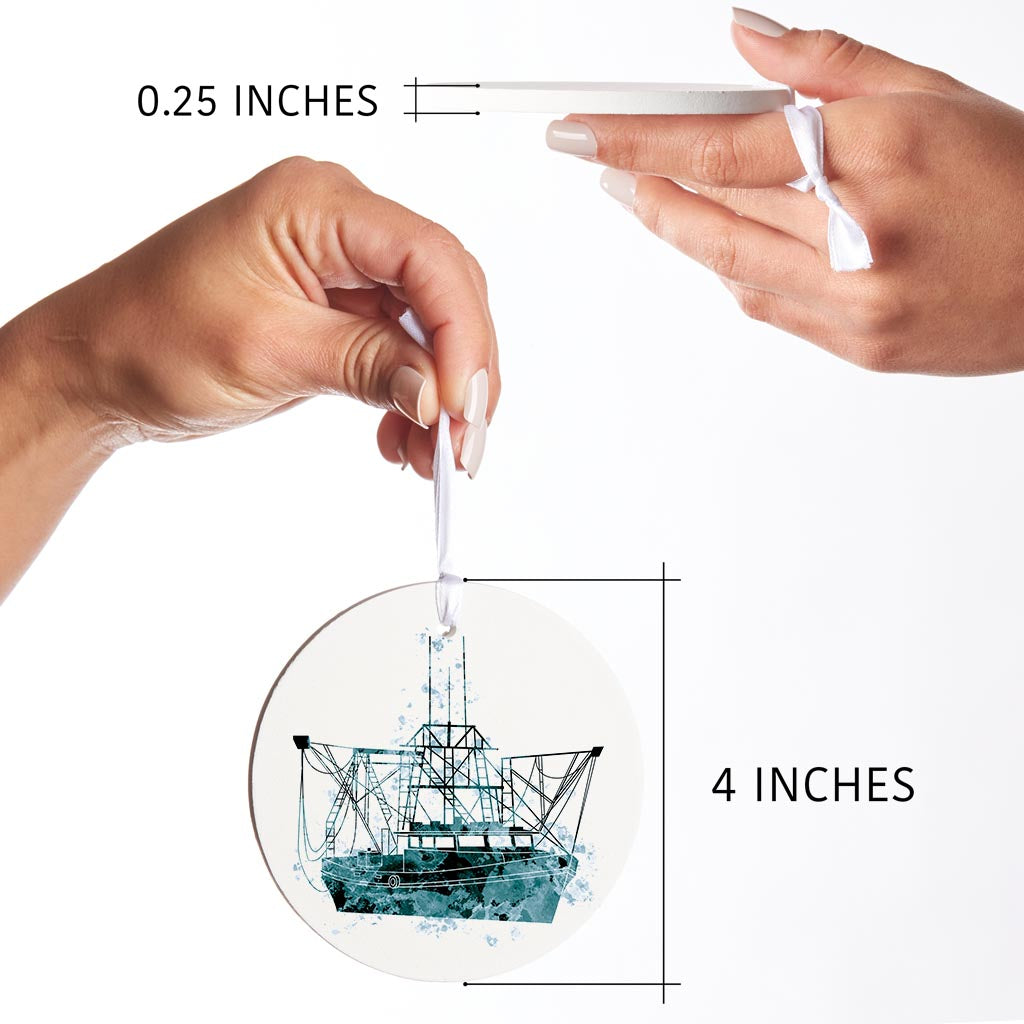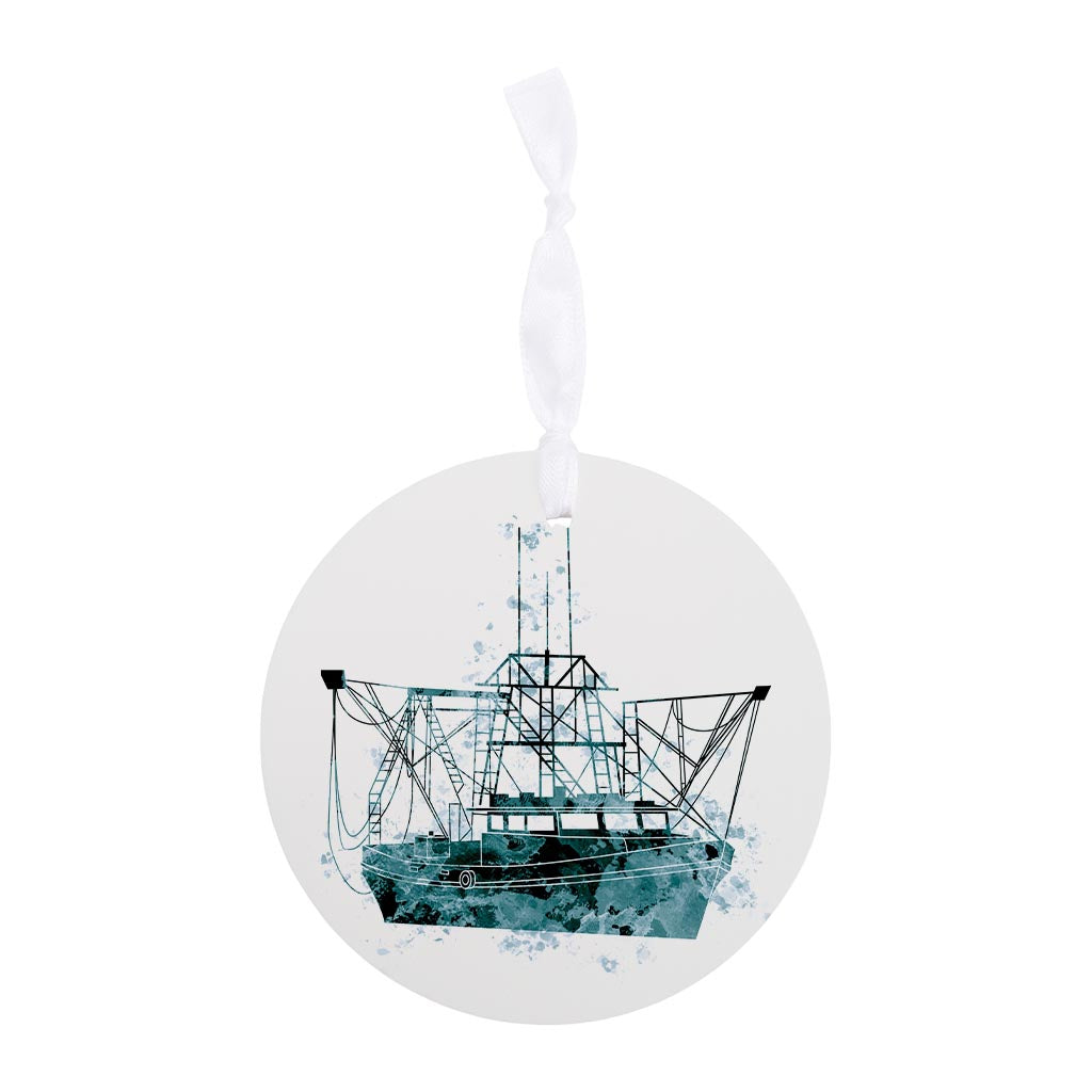 Blue White Water Color Shrimp Boat | Wood Ornament | Eaches | Min 6
