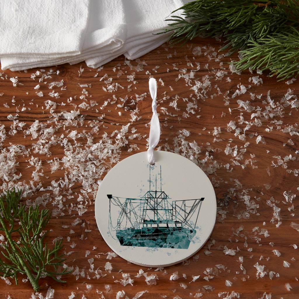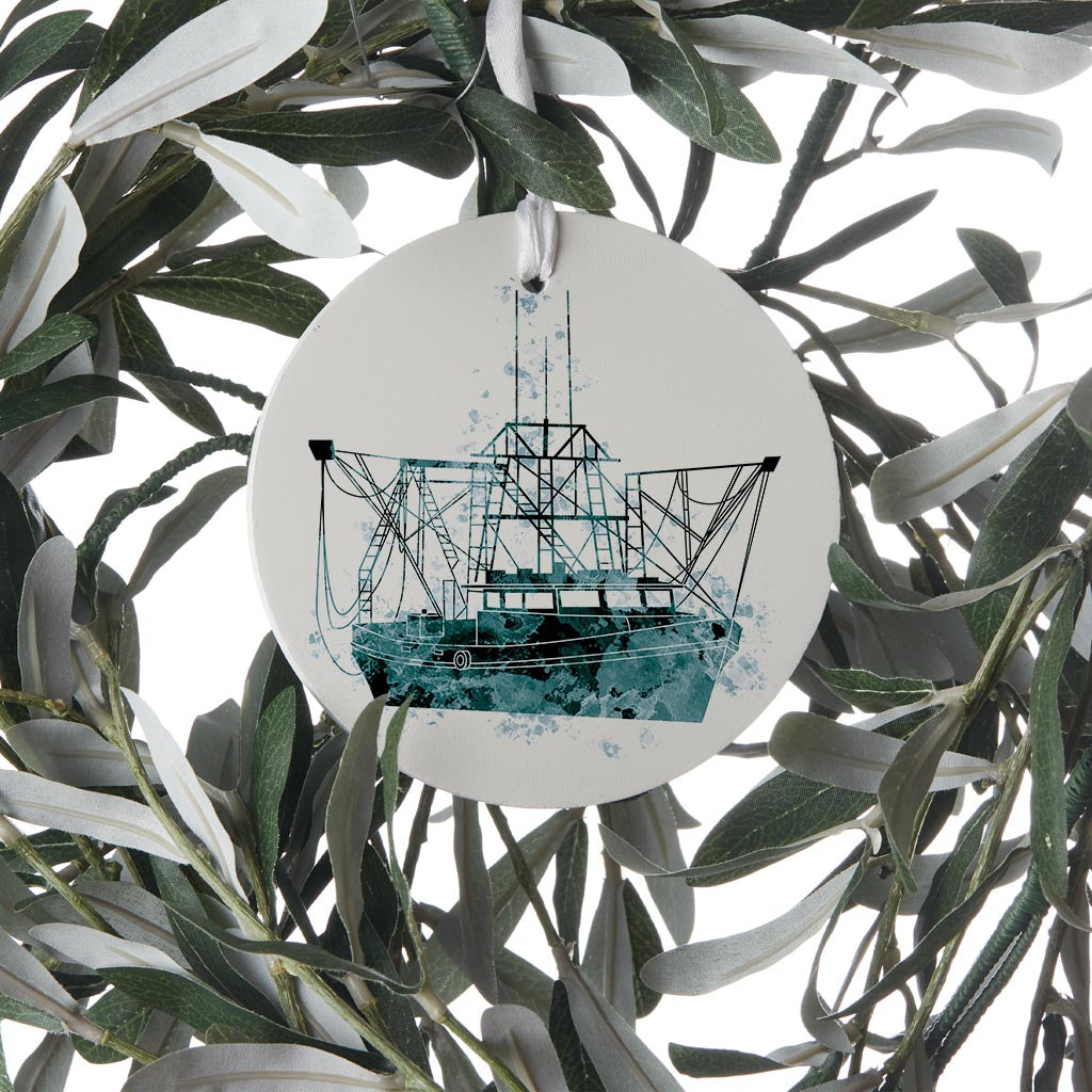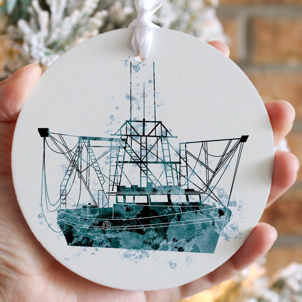 Blue White Water Color Shrimp Boat | Wood Ornament | Eaches | Min 6