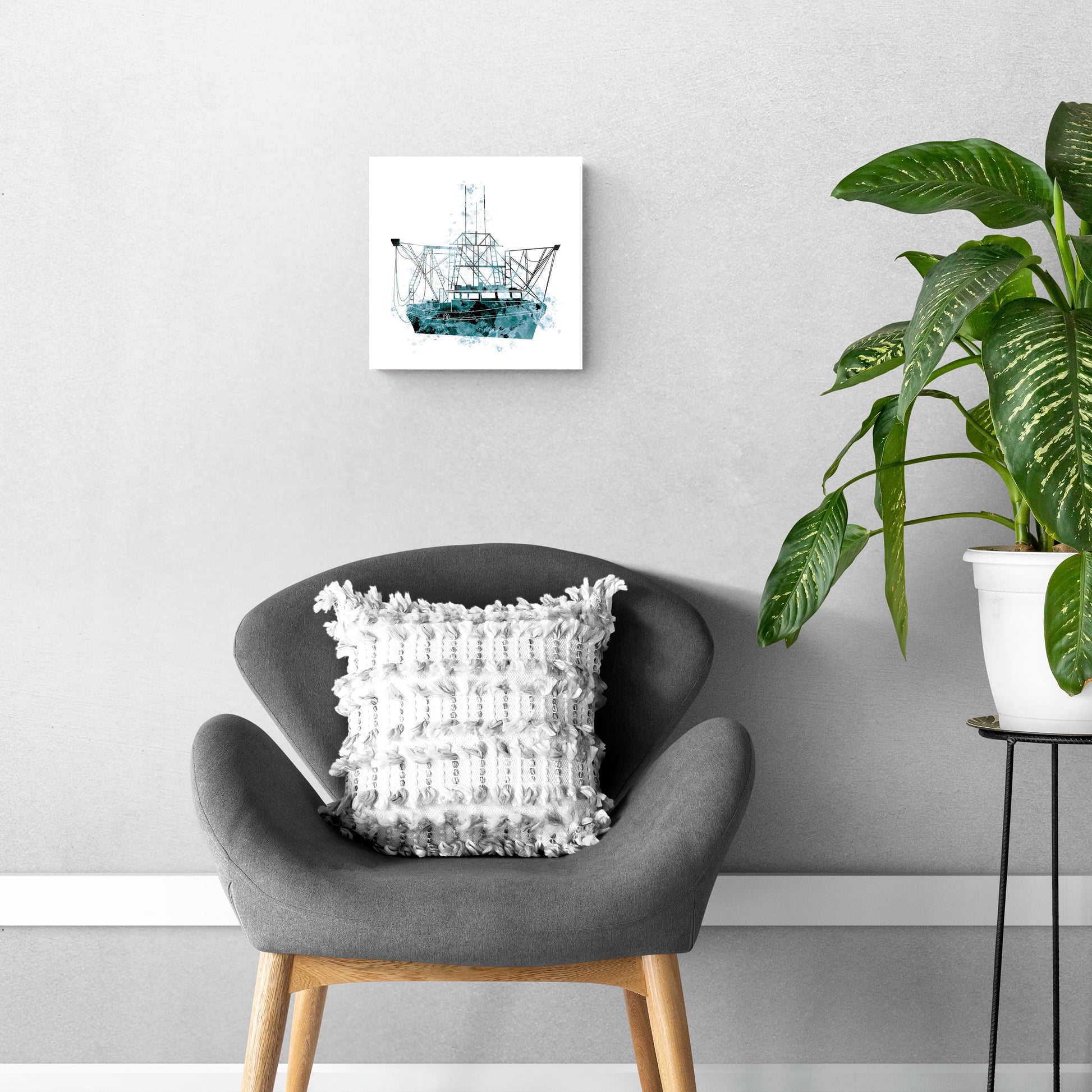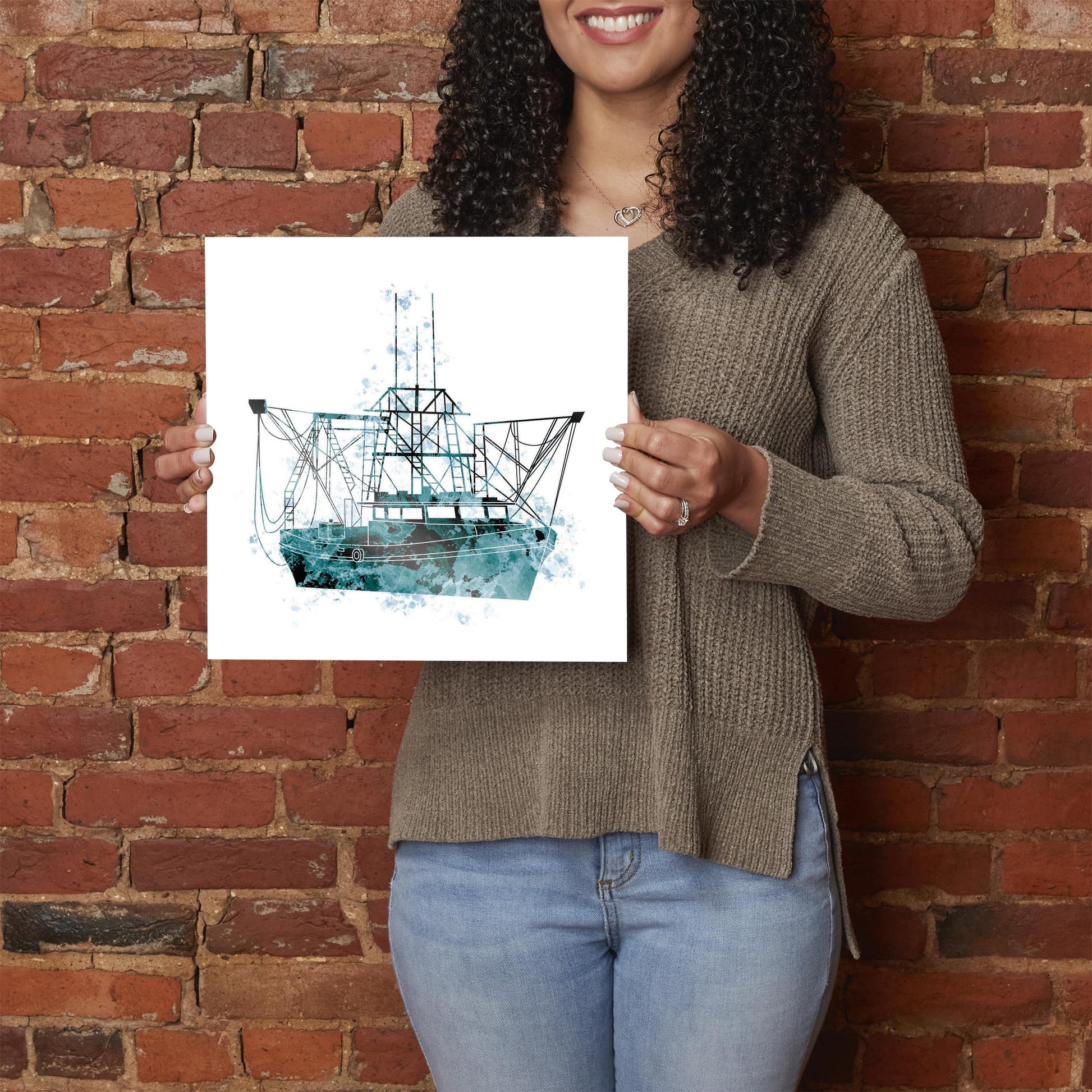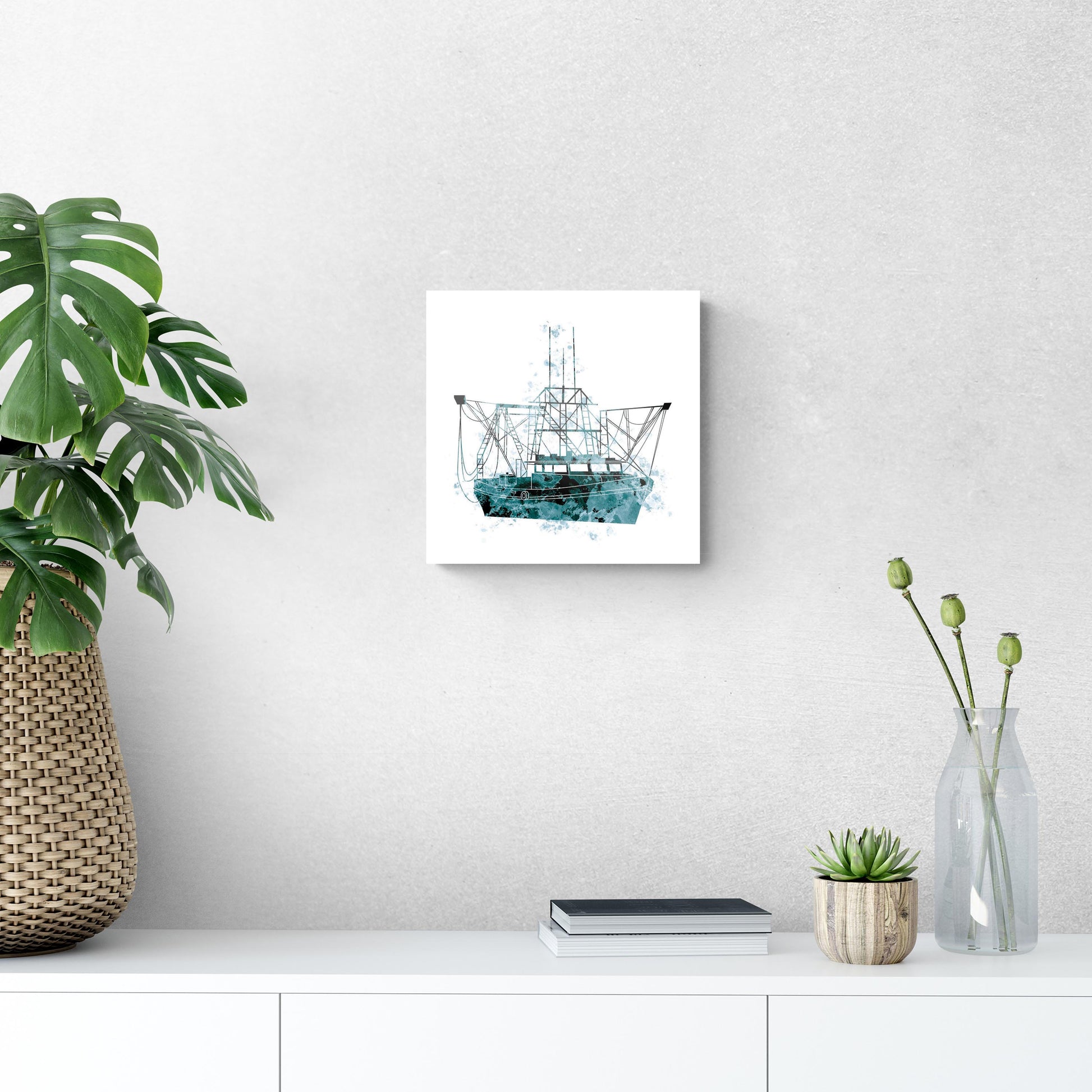 Blue White Water Color Shrimp Boat | Hi-Def Glass Art | Eaches | Min 1