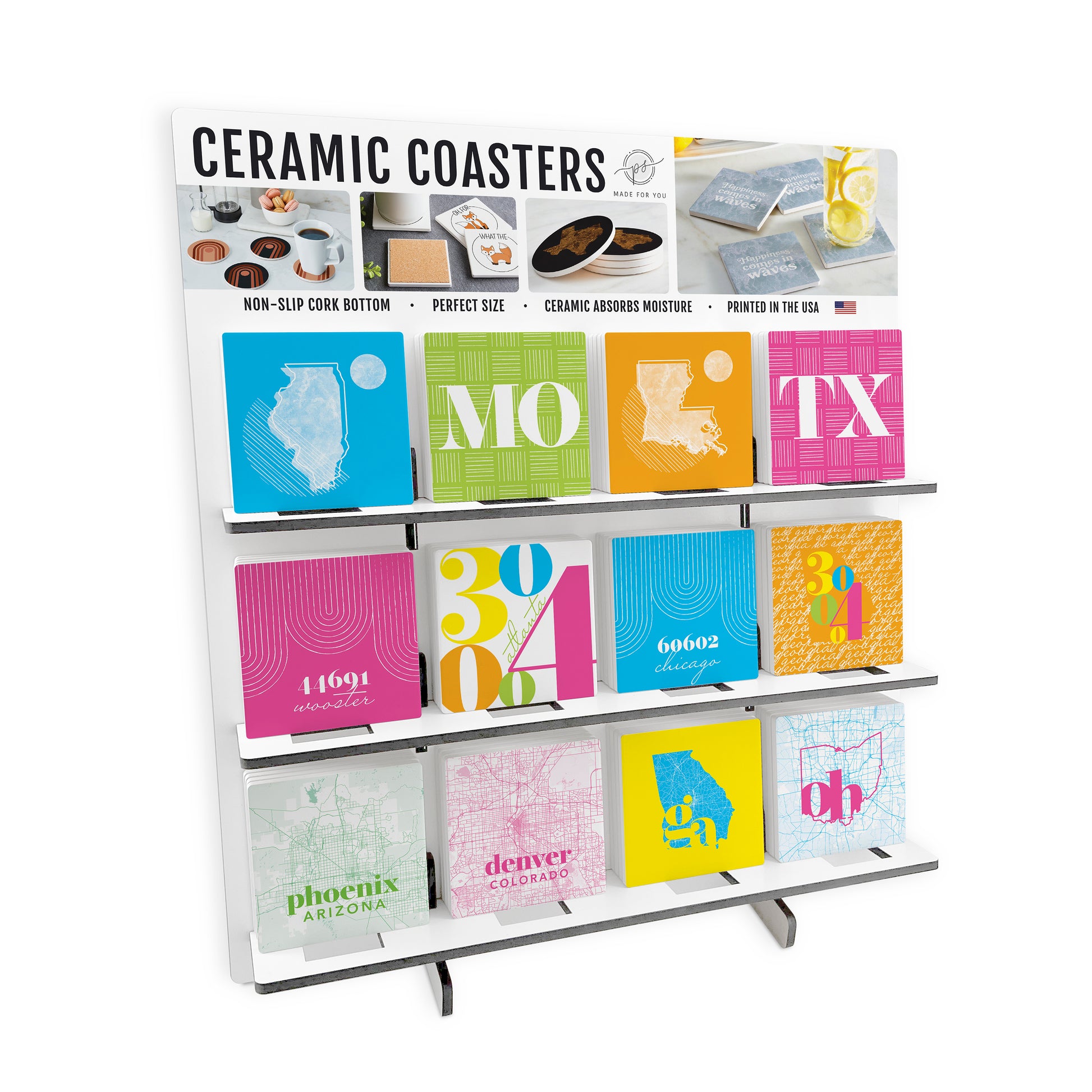 Coaster Point of Purchase Display containing 4 each of 12 designs. Quick and easy assembly and sturdy enough to move from location to location. Display measures 10.5 x 18.5 x 20in using minimal space. Easy reorders with low minimums.