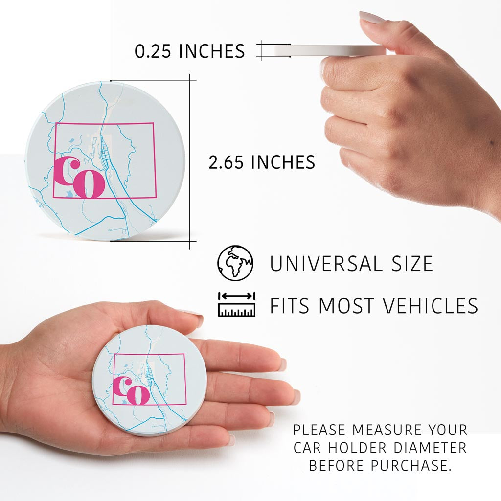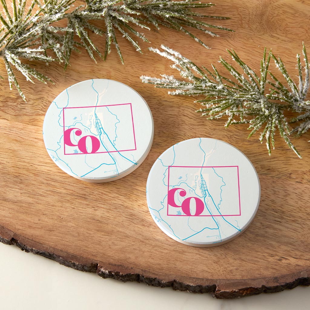 Bright Modern State Map Blue Colorado Creede| Absorbent Car Coasters | Set of 2 | Min 4