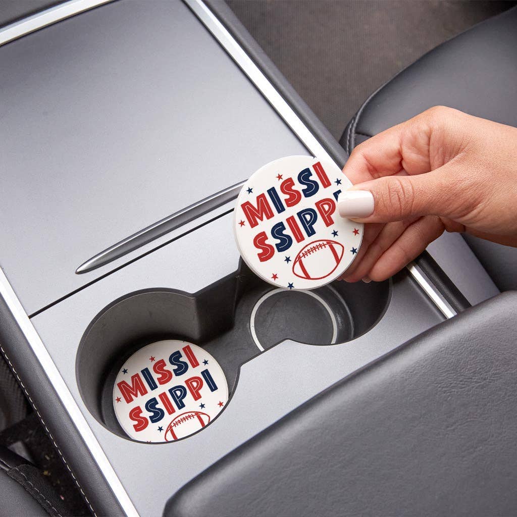 Celebrate the spirit of game day with our Car Coaster Pack, thoughtfully crafted in Laurel, Mississippi. This versatile and stylish set adds a touch of personality to your vehicle while providing practical benefits that every driver will appreciate. Designed to absorb spills from your morning coffee or sticky juice boxes, these coasters protect your cupholders from clutter and grime. Each coaster features a strategic divot edge, making them effortlessly removable for easy cleaning—no more wrestling with stubborn residue hidden in the depths of your cupholder.