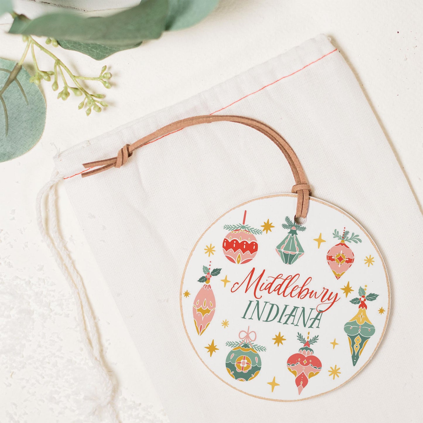 Celebrate the charm of Middlebury, Indiana, with our beautifully handcrafted 4-inch round ornaments, made with care in Laurel, Mississippi. Each ornament is designed to reflect the spirit of this beloved community, bringing warmth and joy to your seasonal celebrations. Perfect for adorning your holiday tree or adding a touch of festive cheer year-round, these ornaments invite delightful nostalgia into any space.
