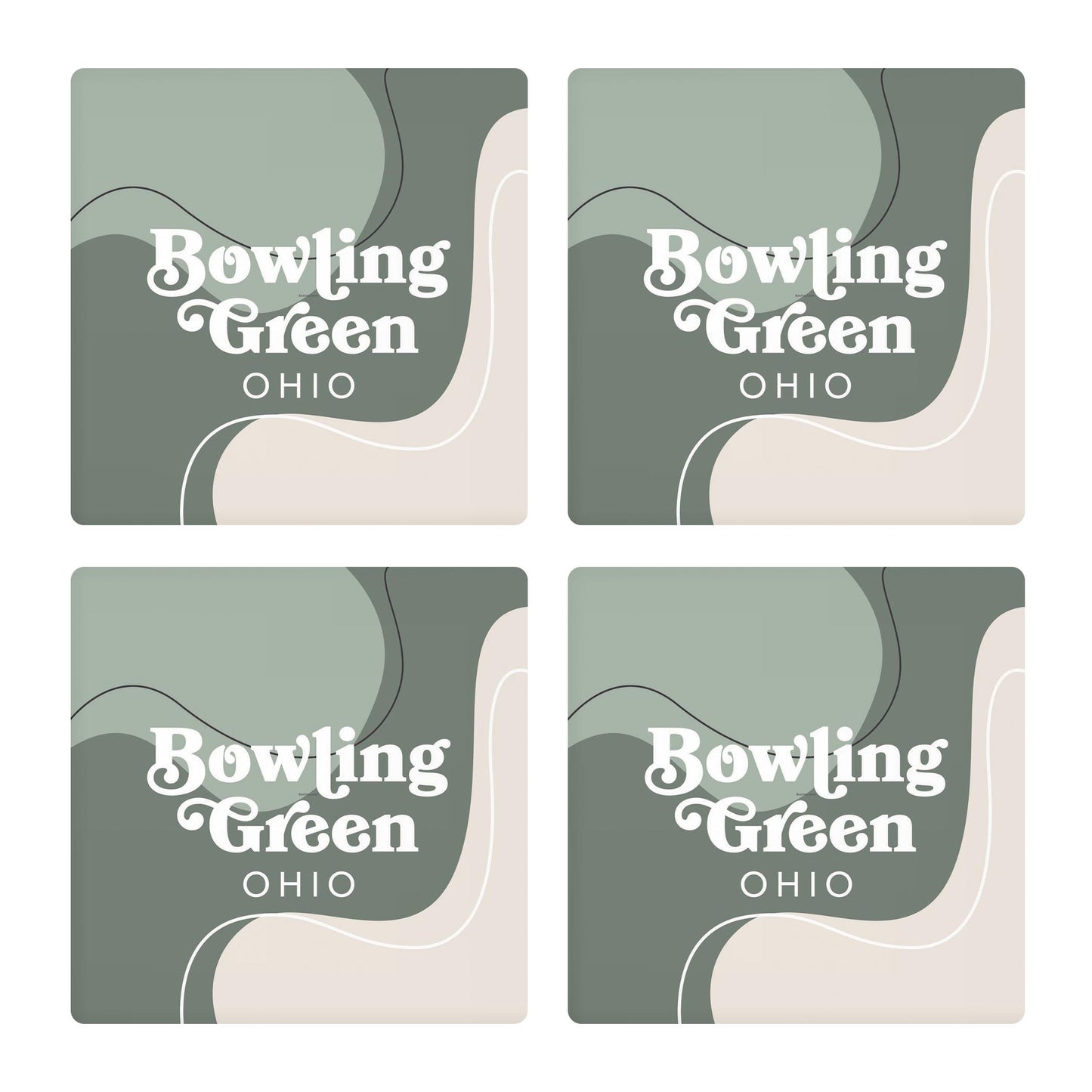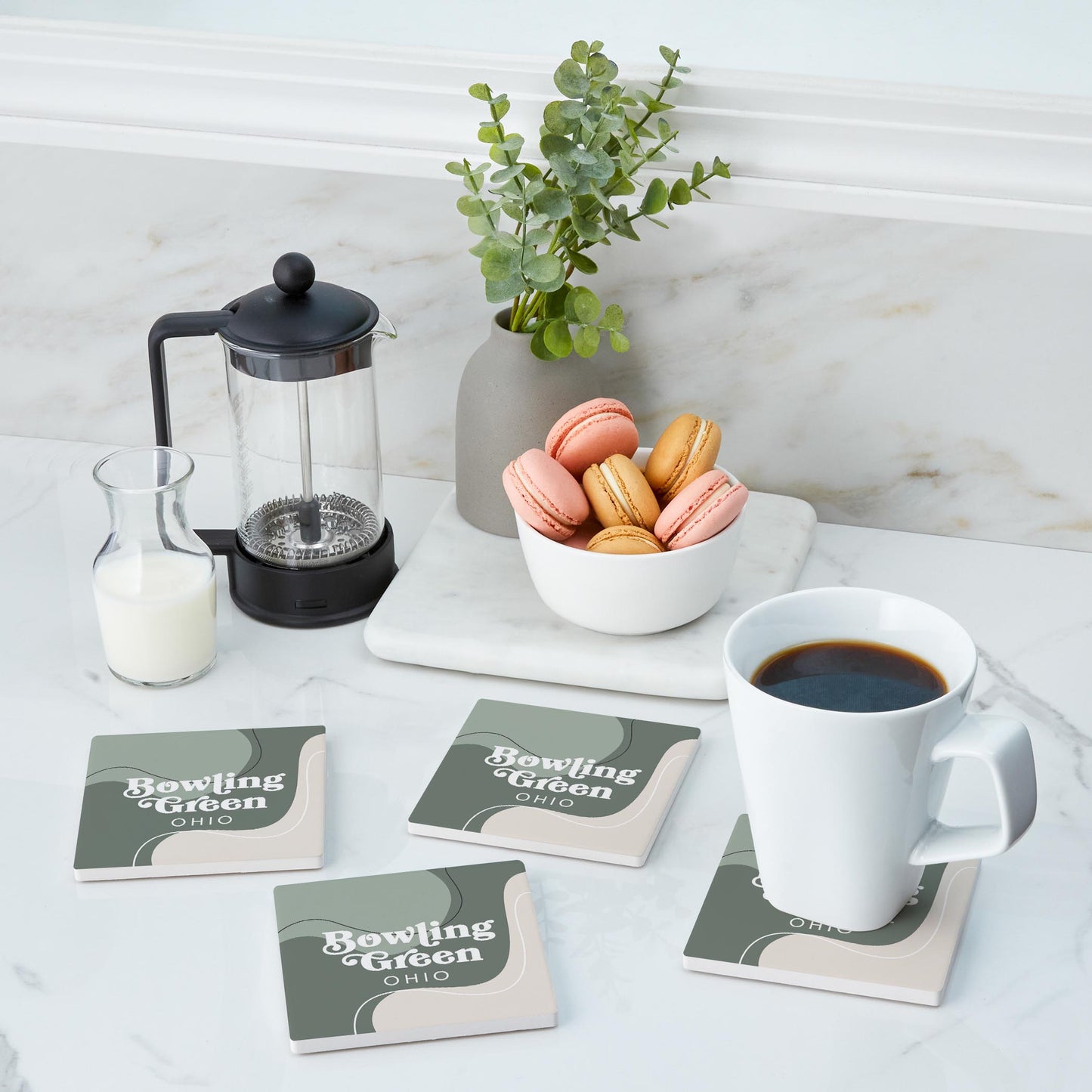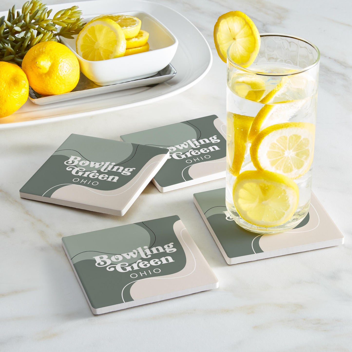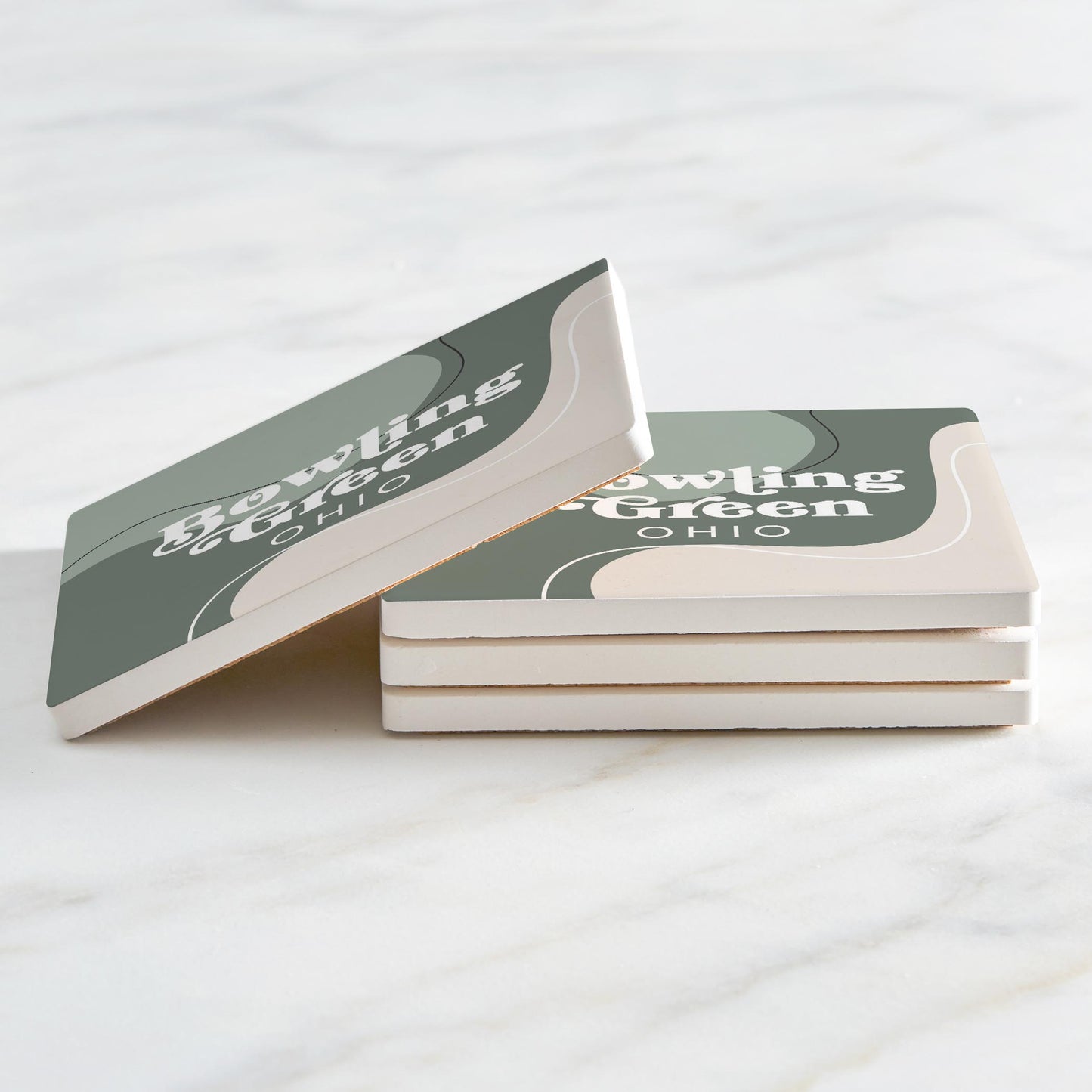 Ceramic Square Coaster 4-Set-Vintage Groove Green Fluid Lines Bowling Green Ohio