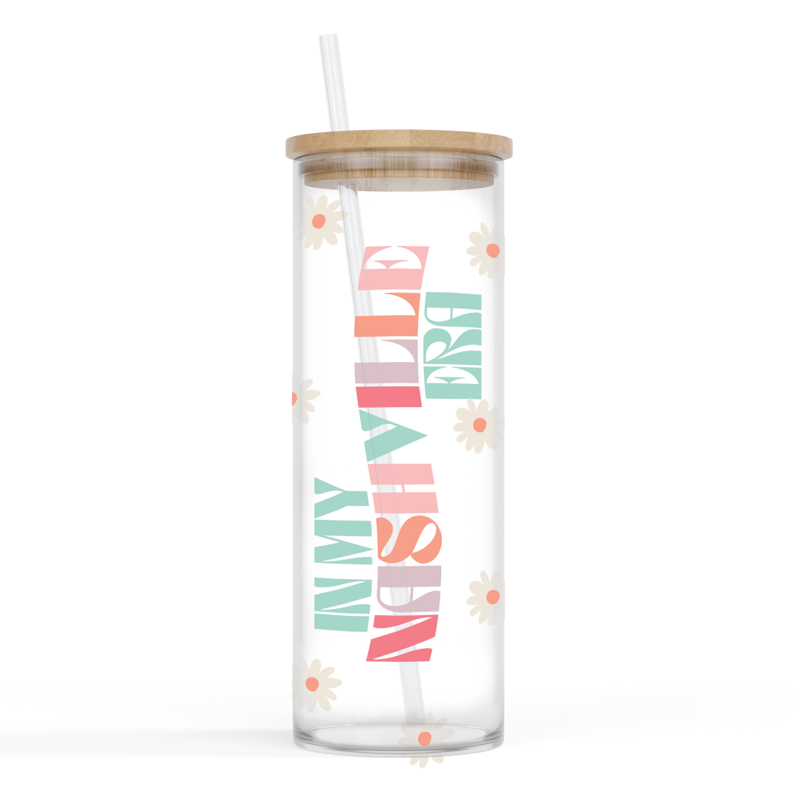Crafted with care, these glass cups not only highlight quality craftsmanship but also bring a touch of retro wave inspiration to any setting. With a classic shape and dimensions that make it easy to hold and enjoy, the top measures 2.87” and stands at a height of 8”, ideal for staying hydrated in style. The use of durable glass paired with a sustainable bamboo lid reflects our commitment to quality and the environment, ensuring that customers feel good about their purchase.