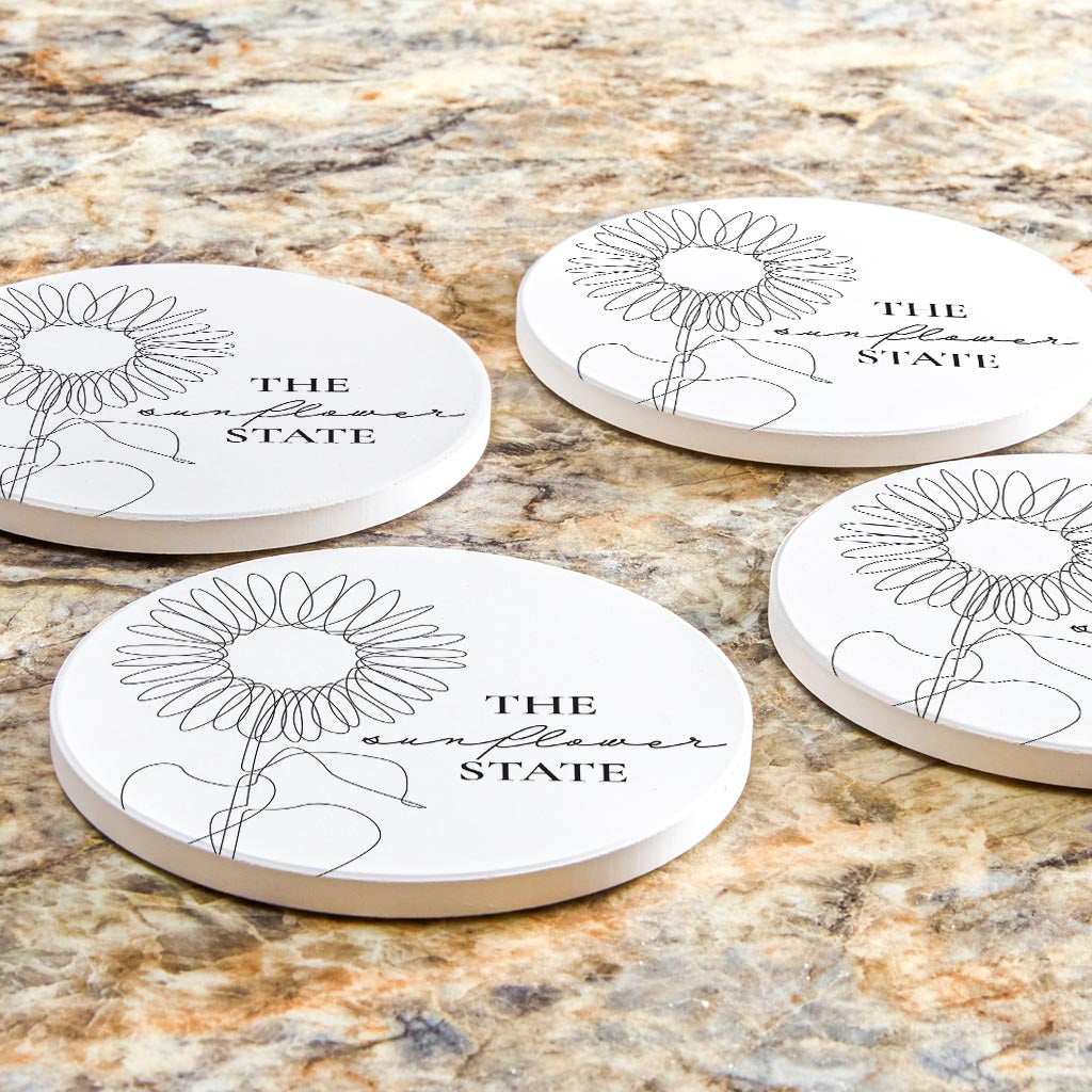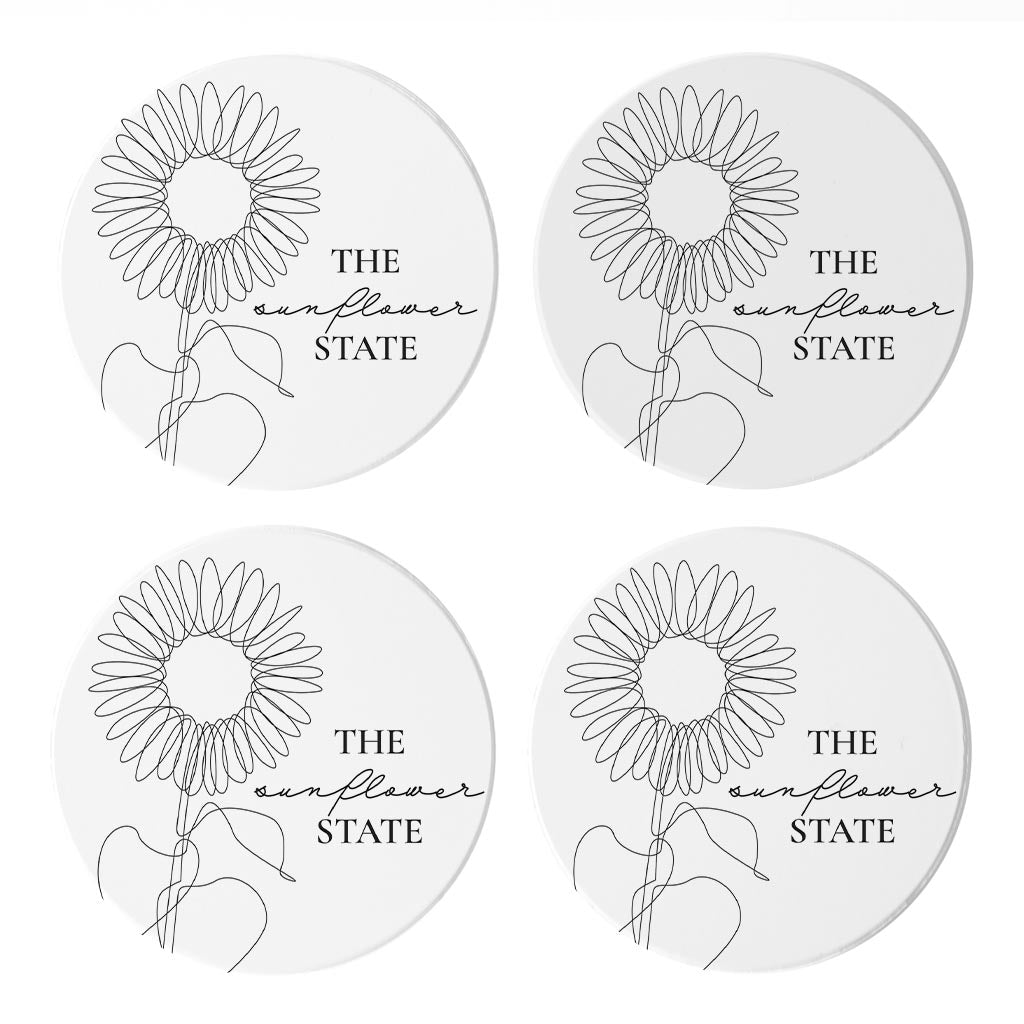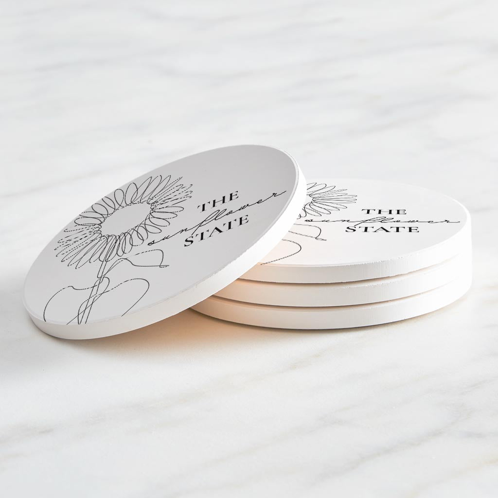 Minimalist B&W Kansas Sunflower Line Drawing | Absorbent Coasters | Set of 4 | Min 2