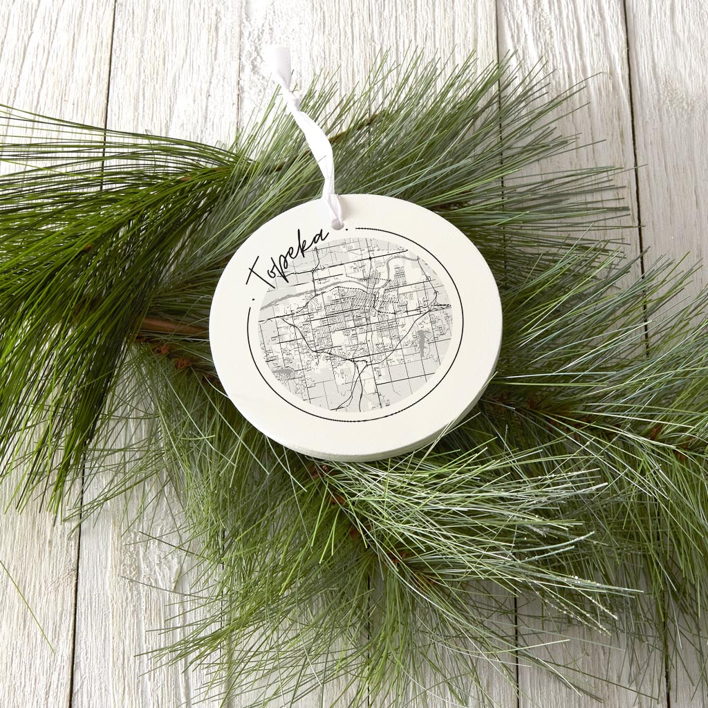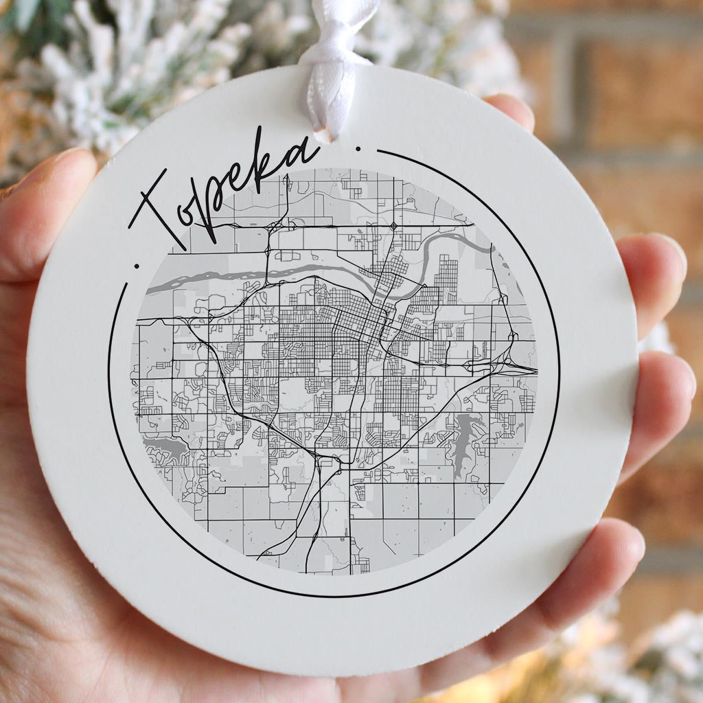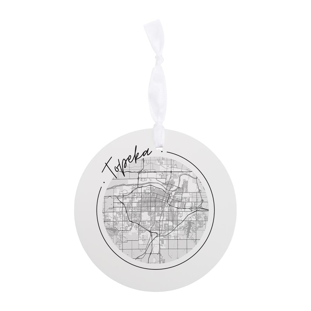 Minimalist B&W Kansas Topeka Circle Map | Wood Ornament | Eaches | Min 6