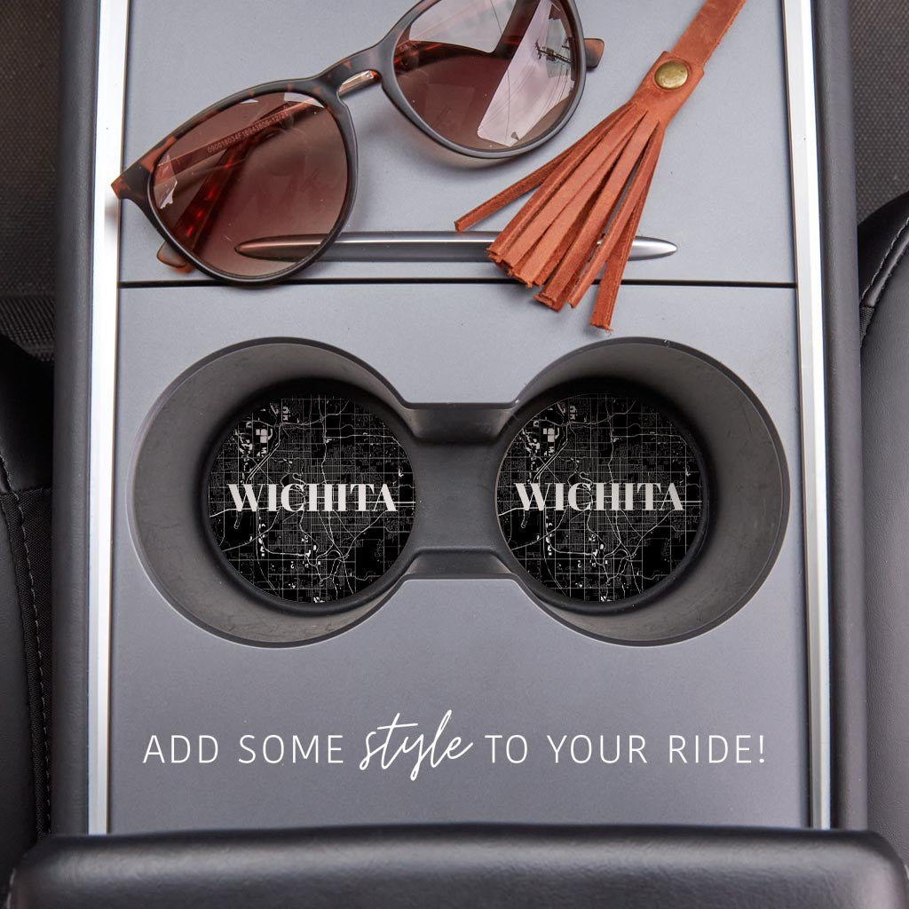 Minimalist B&W Kansas Wichita Map | Absorbent Car Coasters | Set of 2 | Min 4