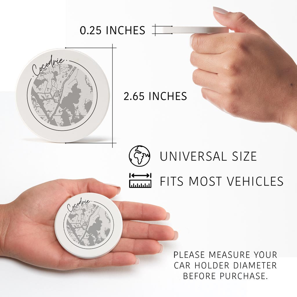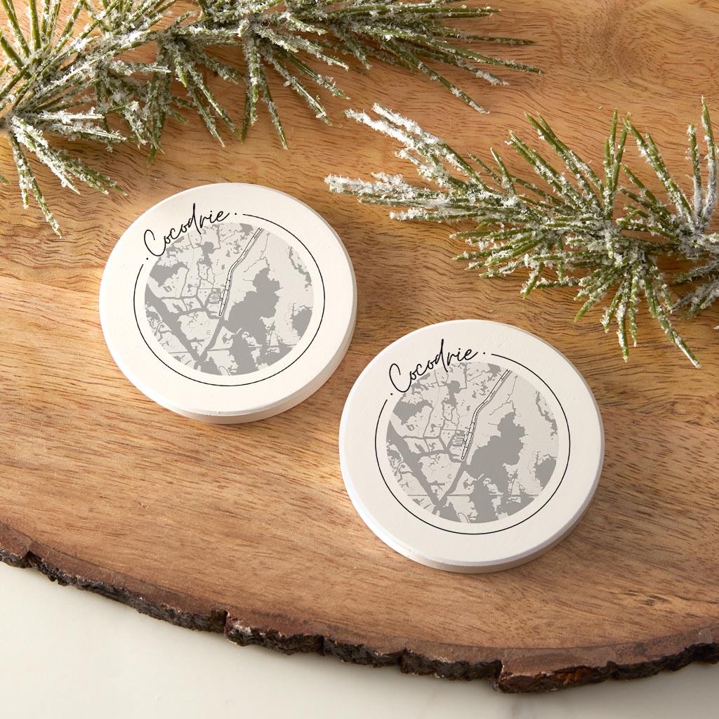 Minimalist B&W Louisiana Cocodrie Circle Map | Absorbent Car Coasters | Set of 2 | Min 4