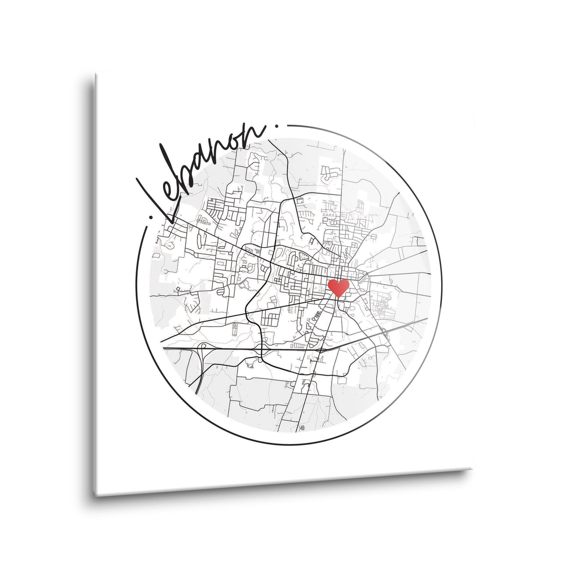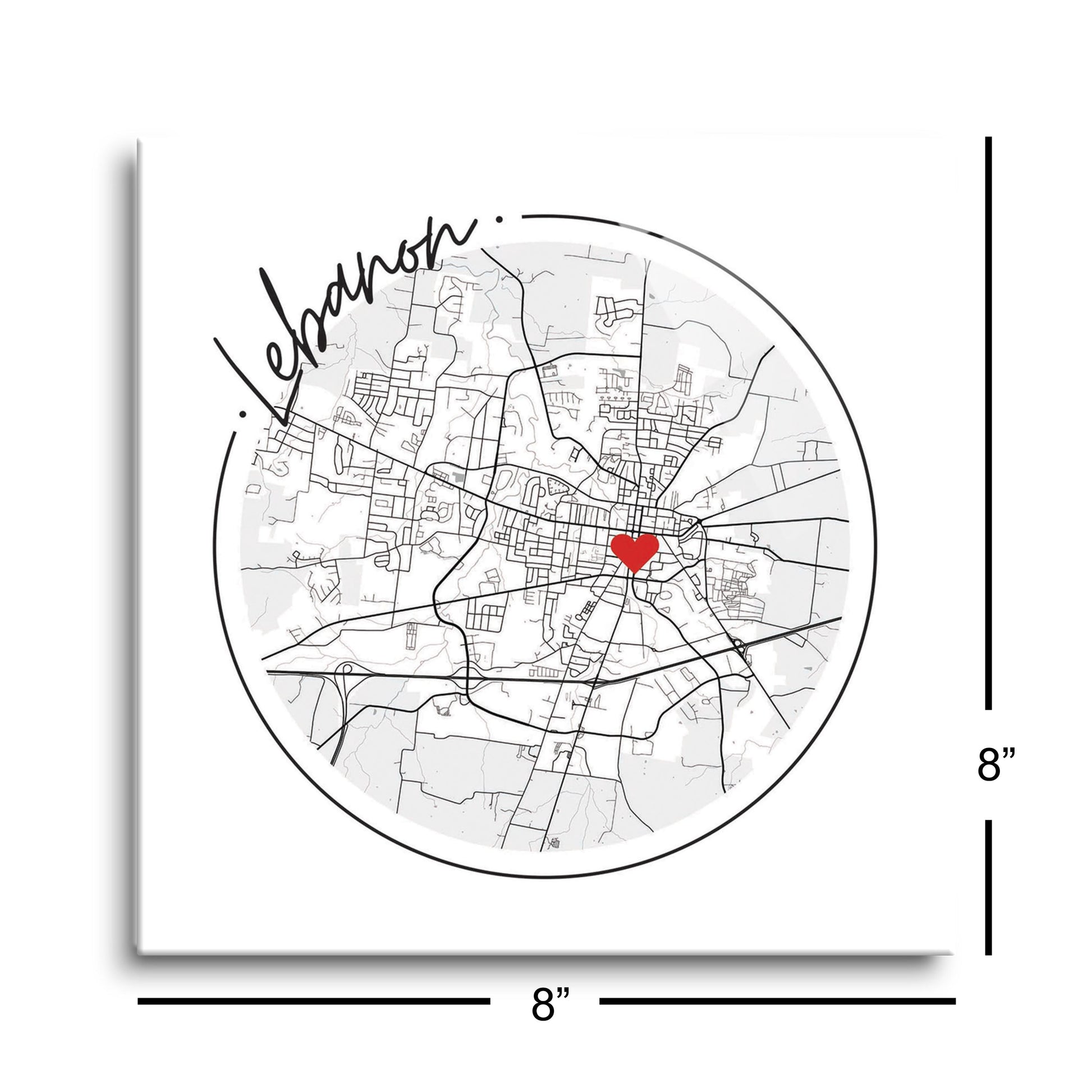 Minimalist B&W Tennessee Lebanon Circle Map Heart | Hi-Def Glass Art | Eaches | Min 2