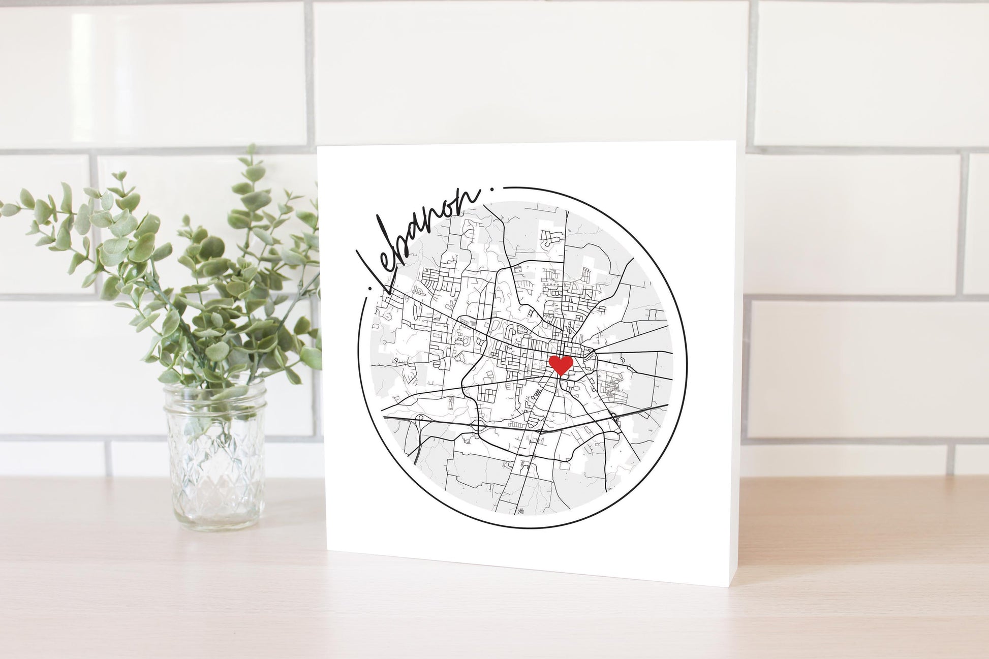 Minimalist B&W Tennessee Lebanon Circle Map Heart | Wood Block | Eaches | Min 2