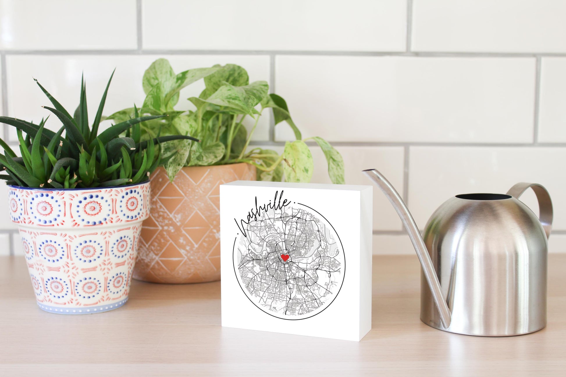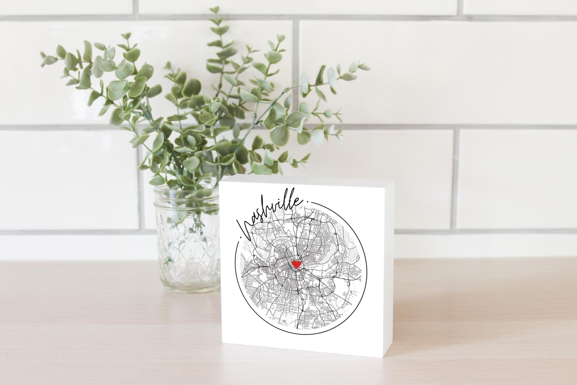 Minimalist B&W Tennessee Nashville Circle Map Heart | Wood Block | Eaches | Min 4