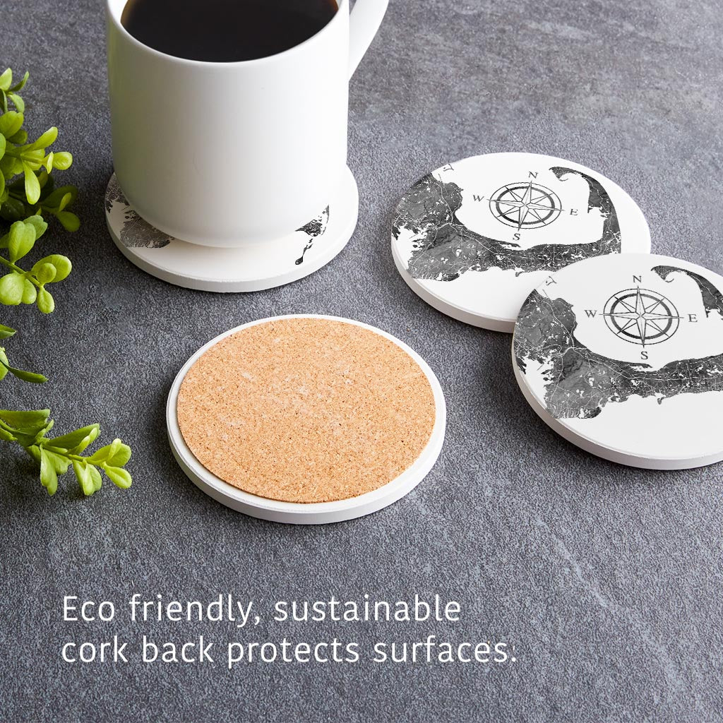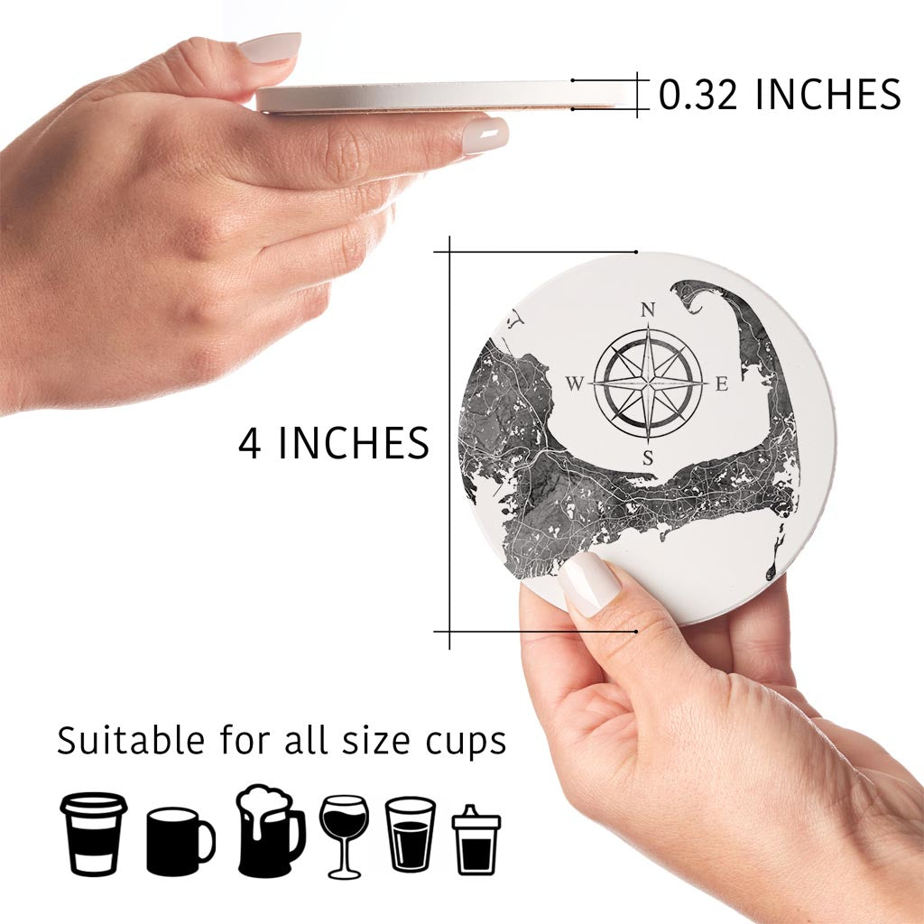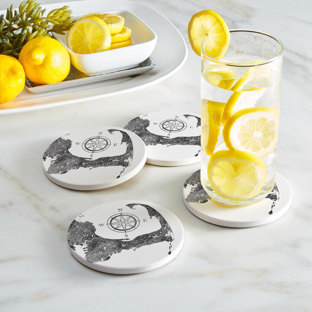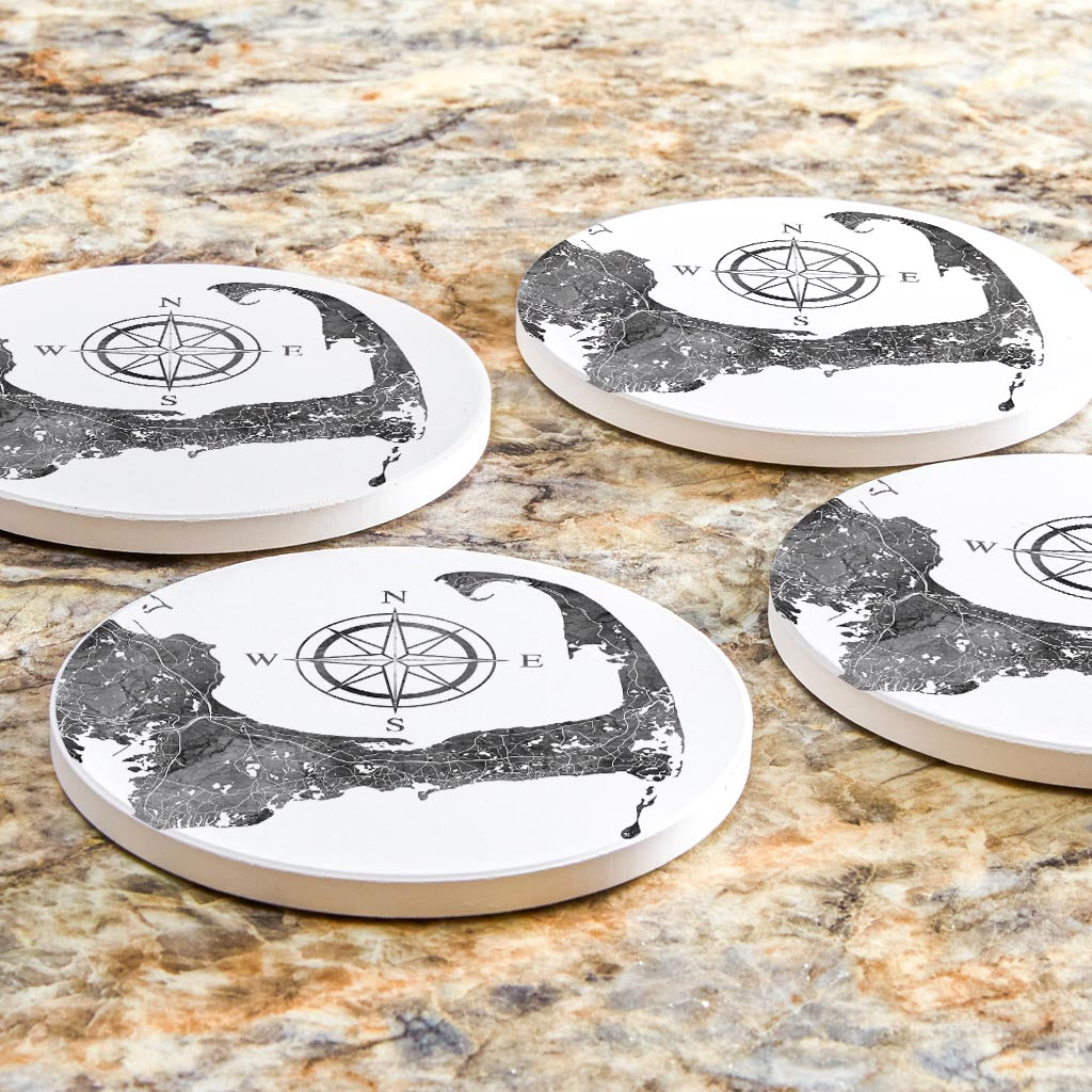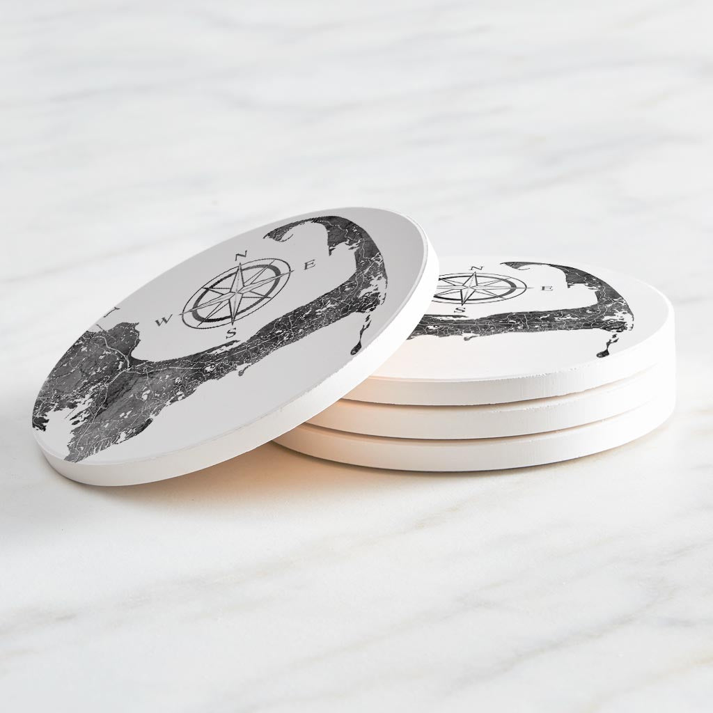 Minimalistic B&W Cape Cod Map With Compass | Absorbent Coasters | Set of 4 | Min 2
