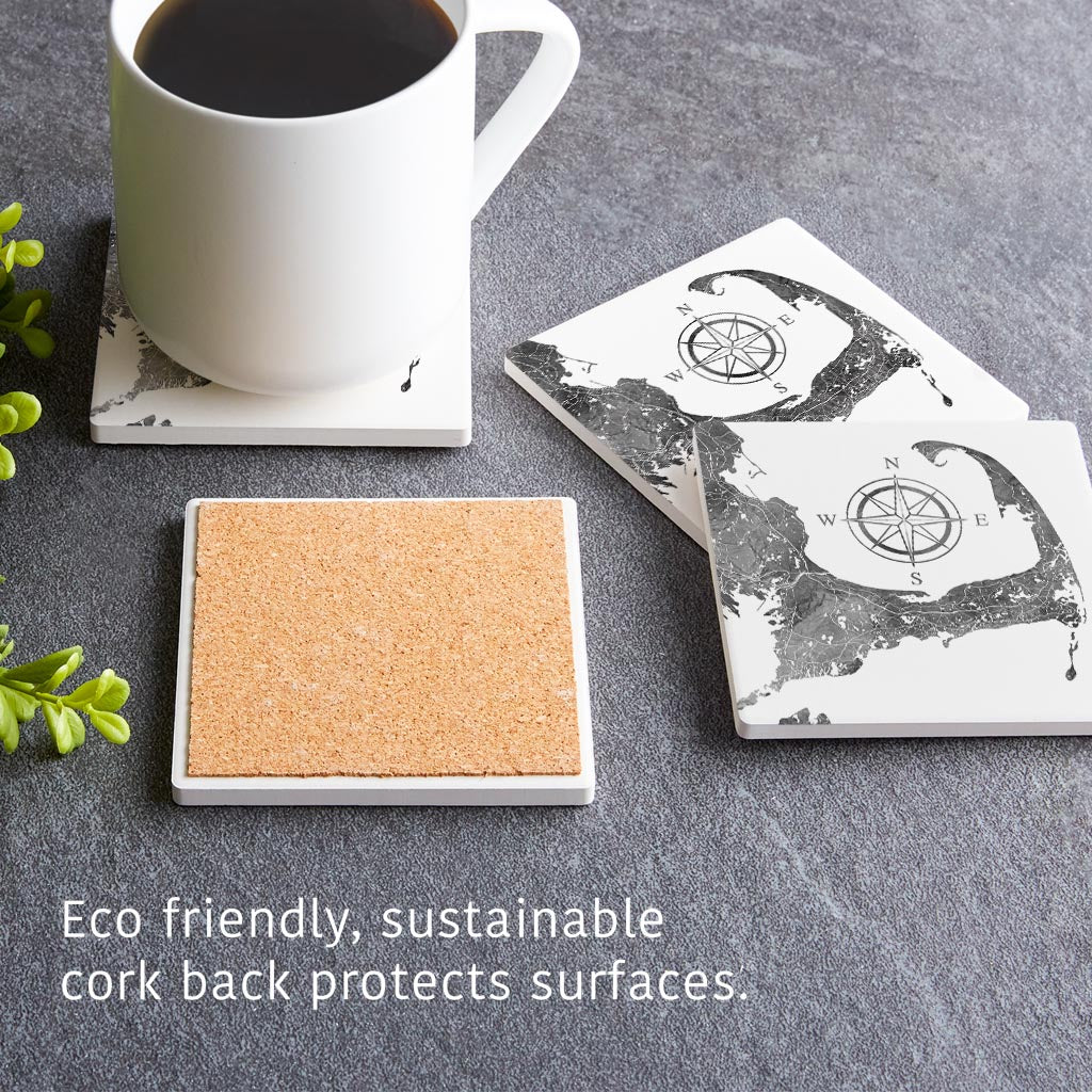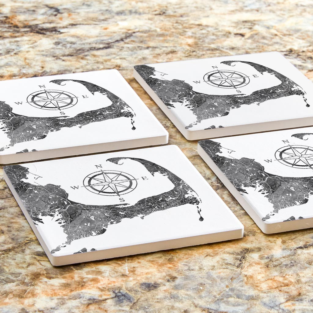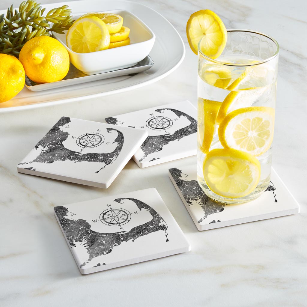 Minimalistic B&W Cape Cod Map With Compass | Absorbent Coasters | Set of 4 | Min 2