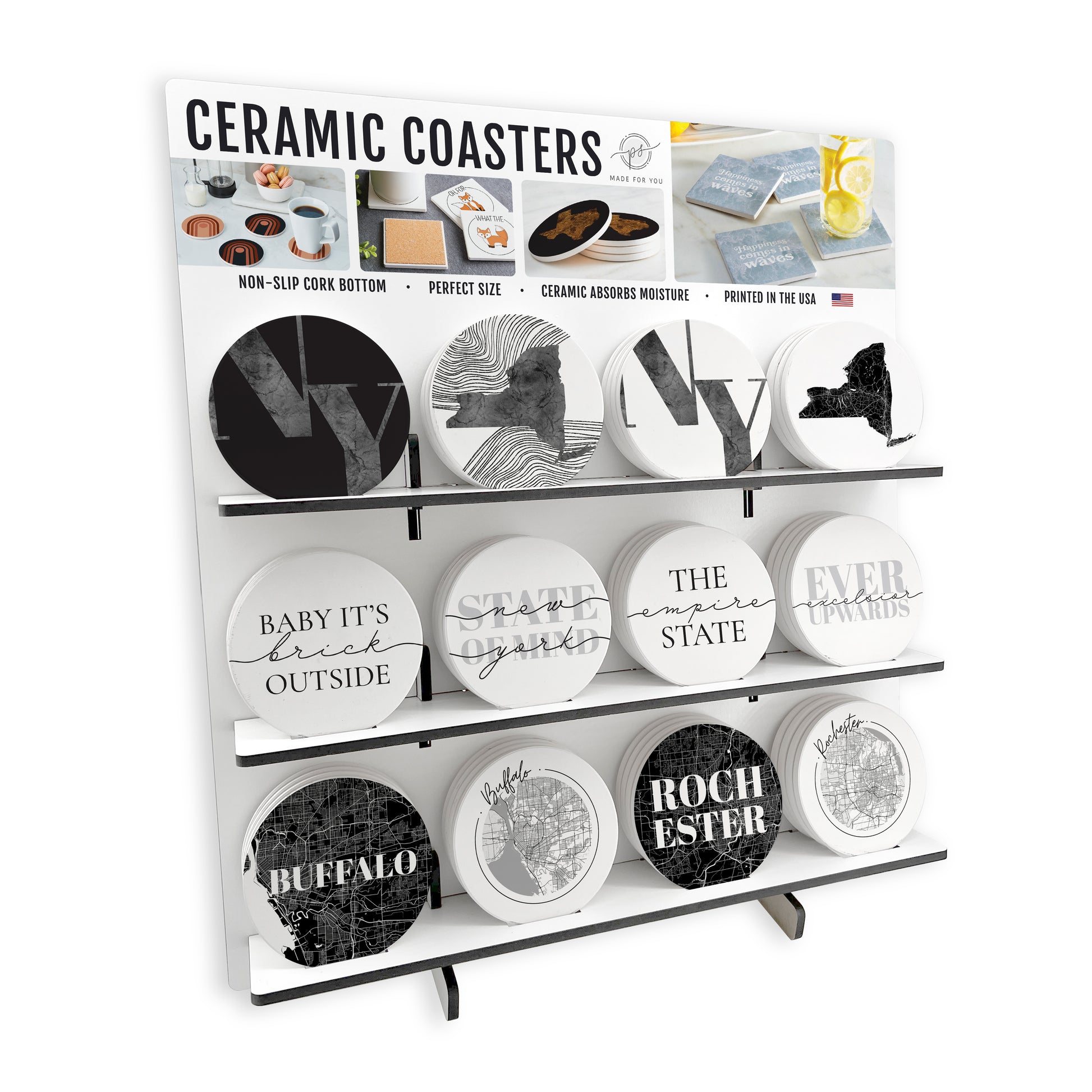 Coaster Point of Purchase Display containing 4 each of 12 designs. Quick and easy assembly and sturdy enough to move from location to location. Display measures 10.5 x 18.5 x 20in using minimal space. Easy reorders with low minimums.