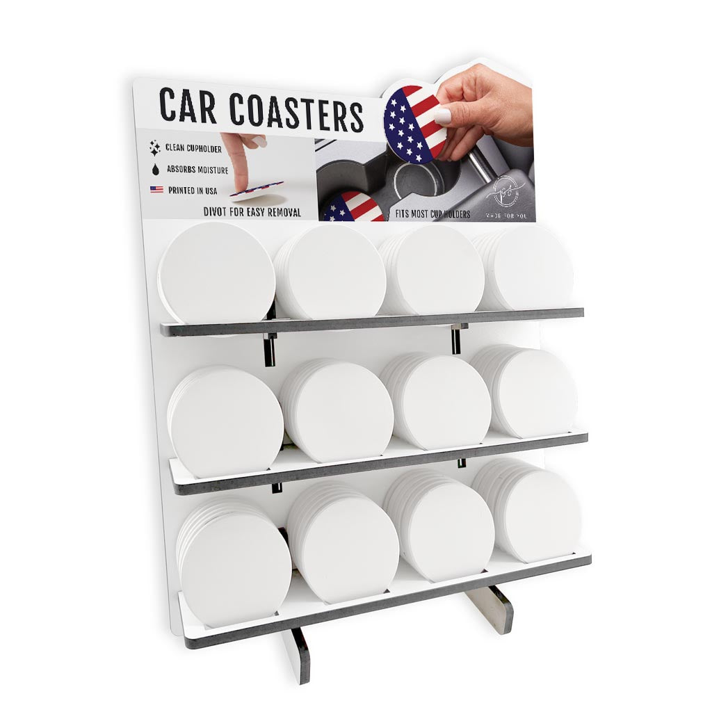 Car Coaster Point of Purchase Display containing 6 each of 12 designs. Quick and easy assembly and sturdy enough to move from location to location. Display measures 8 x 12 x 16in using minimal space. Easy reorders with low minimums.