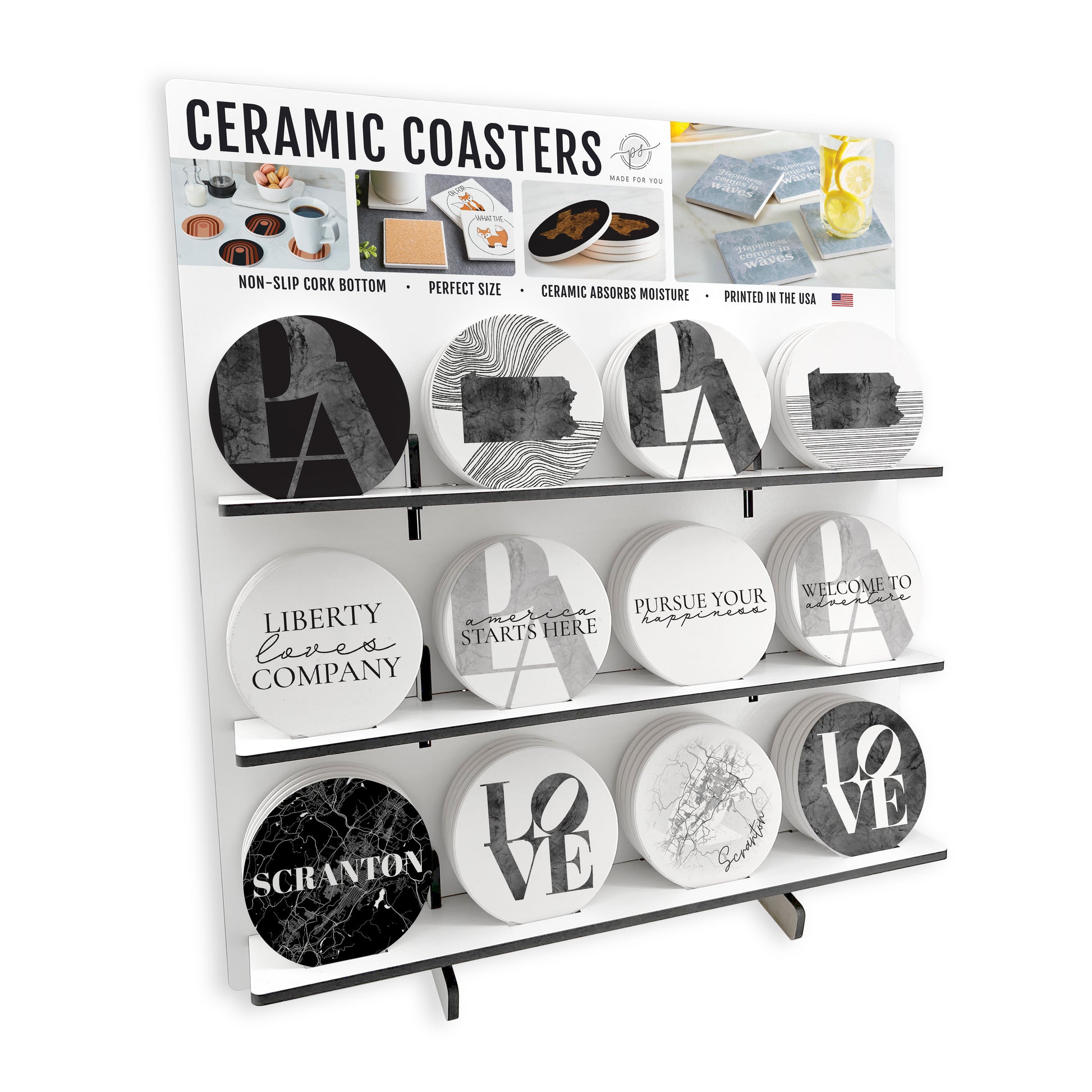 Coaster Point of Purchase Display containing 4 each of 12 designs. Quick and easy assembly and sturdy enough to move from location to location. Display measures 10.5 x 18.5 x 20in using minimal space. Easy reorders with low minimums.