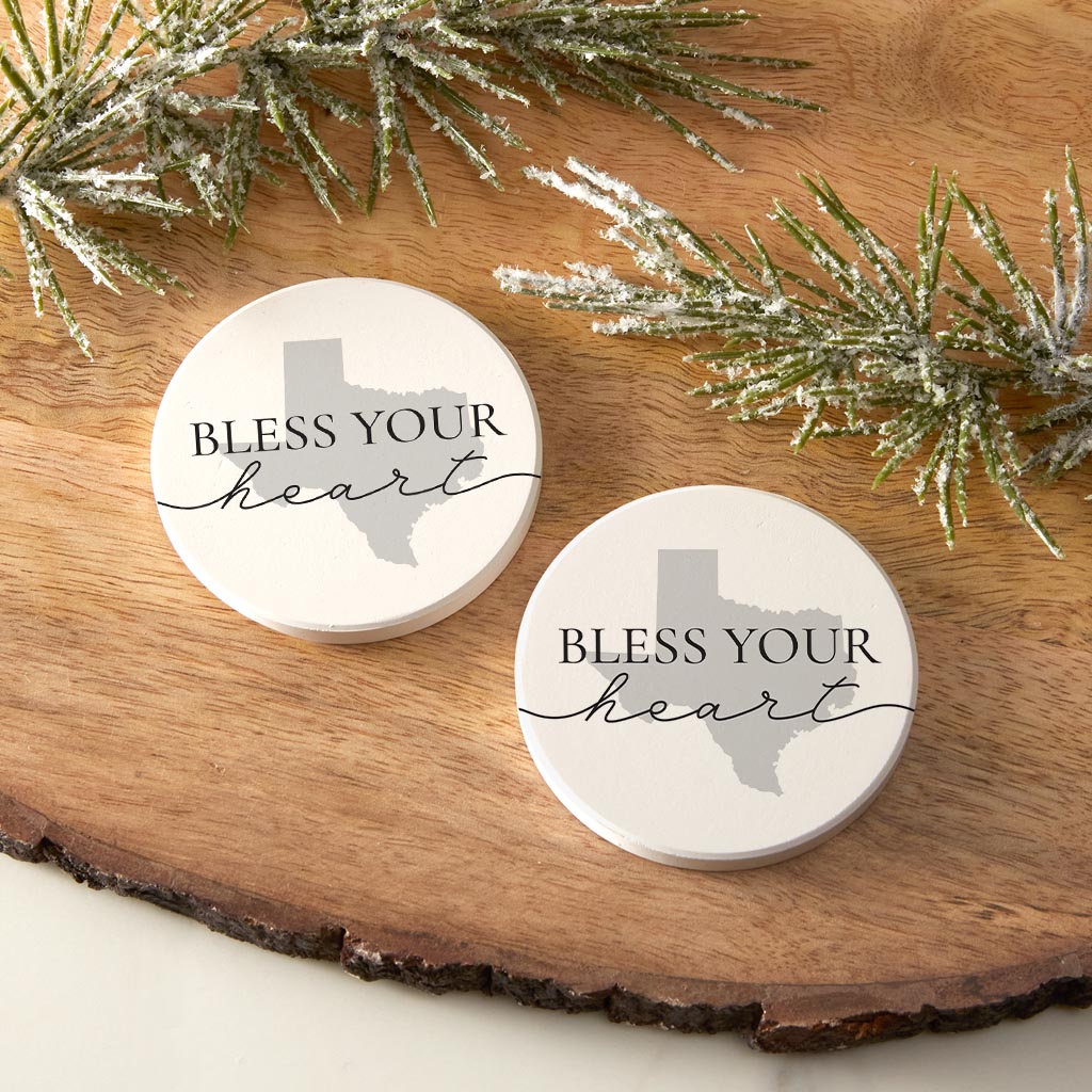 Minimalistic B&W Texas Bless Your Heart | Absorbent Car Coasters | Set of 2 | Min 4