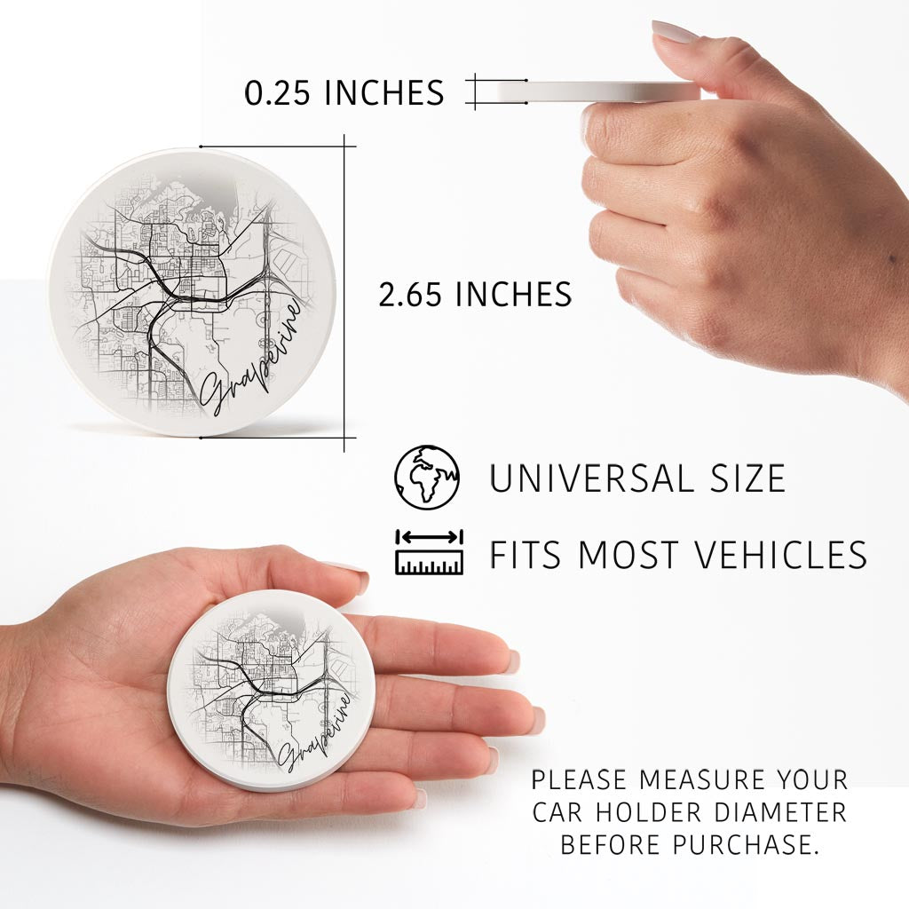 Minimalistic B&W Texas Grapevine Circle Map | Absorbent Car Coasters | Set of 2 | Min 4