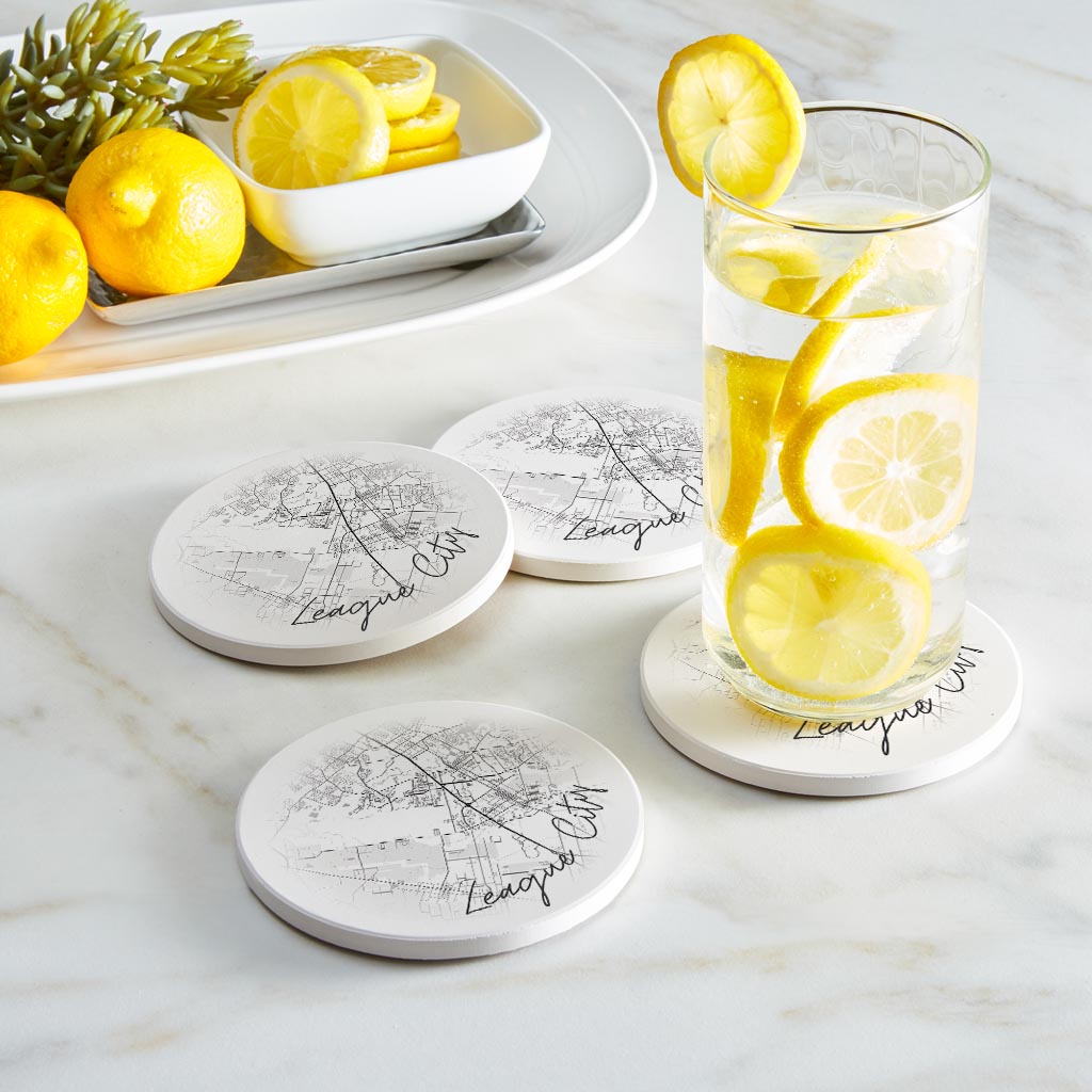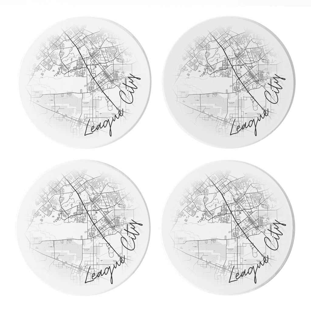 Minimalistic B&W Texas League City Circle Map | Absorbent Coasters | Set of 4 | Min 2