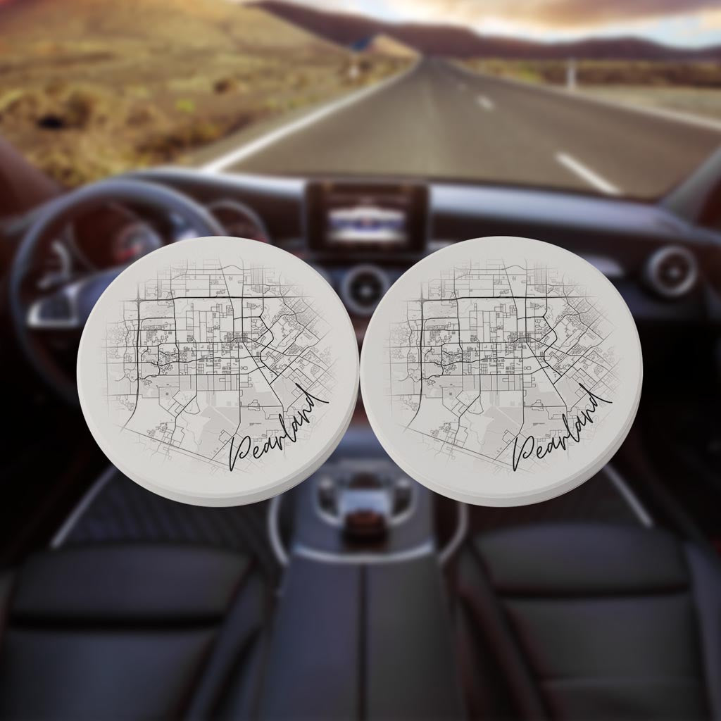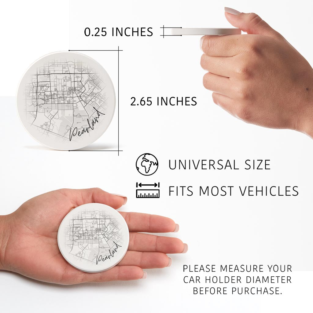 Minimalistic B&W Texas Pearland City Circle Map | Absorbent Car Coasters | Set of 2 | Min 4