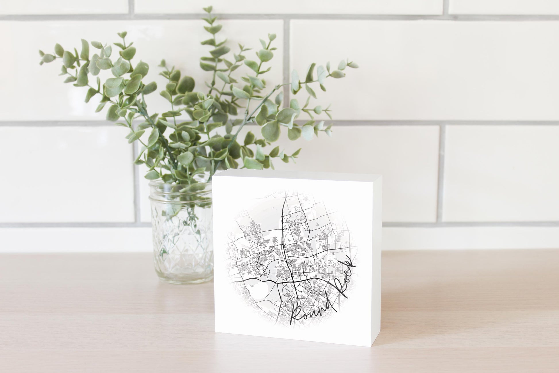 Minimalistic B&W Texas Round Rock Circle Map | Wood Block | Eaches | Min 4