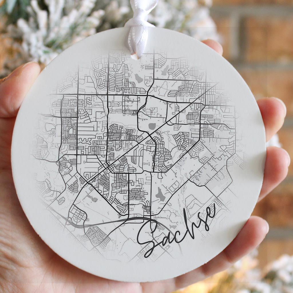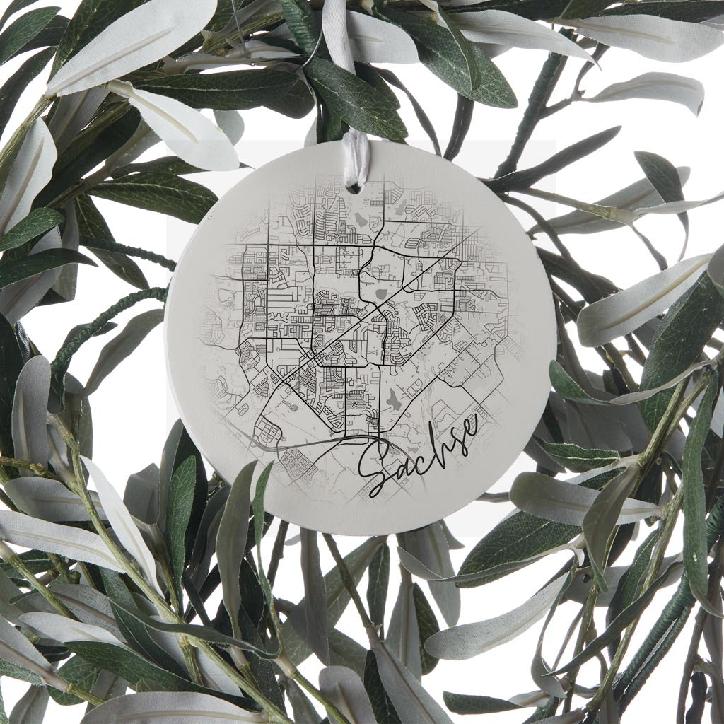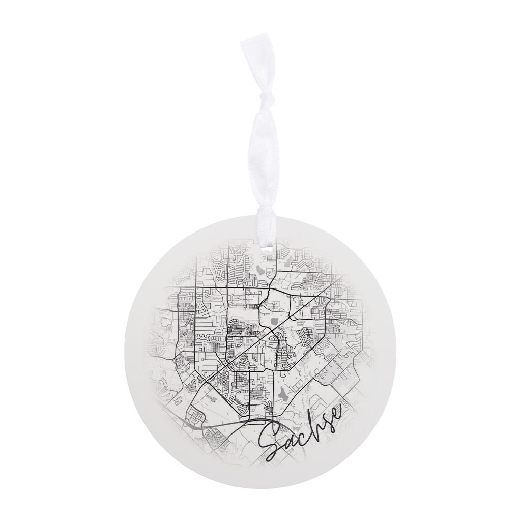 Minimalistic B&W Texas Sachse Circle Map | Wood Ornament | Eaches | Min 6
