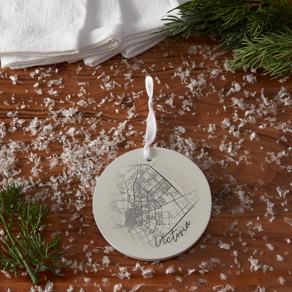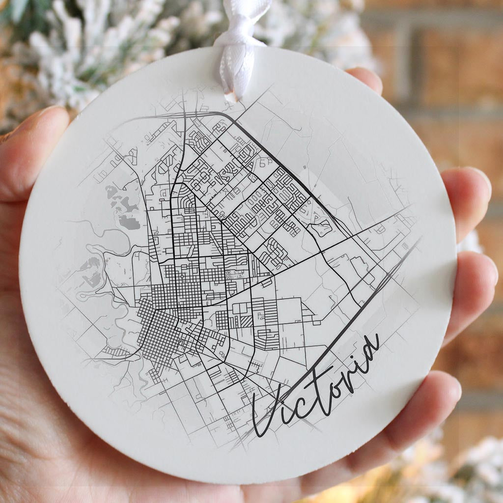 Minimalistic B&W Texas Victoria Circle Map | Wood Ornament | Eaches | Min 6