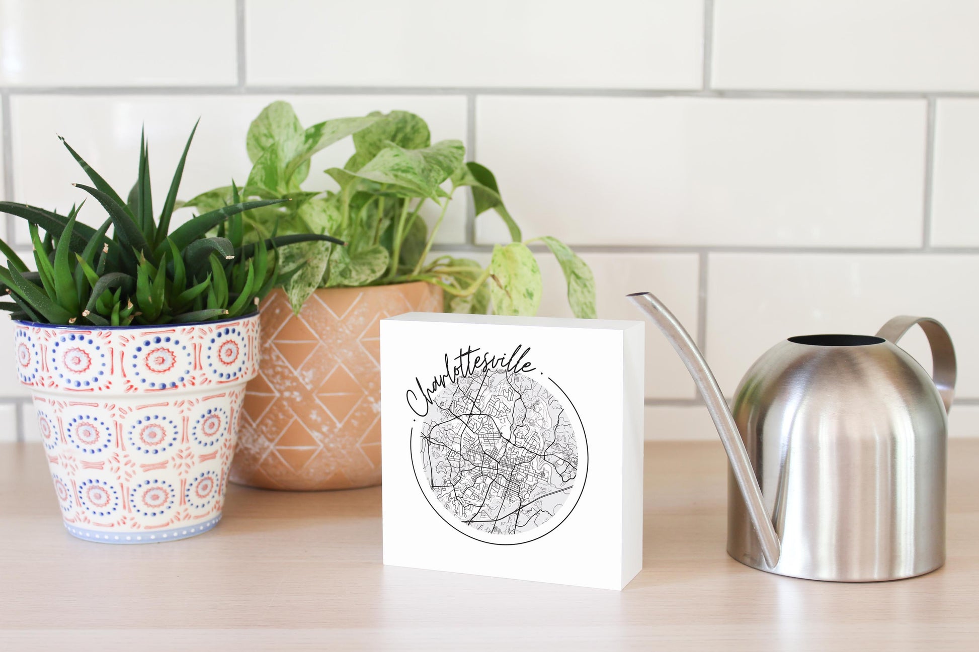 Minimalistic B&W Virginia Charlottesville Circle Map | Wood Block | Eaches | Min 4