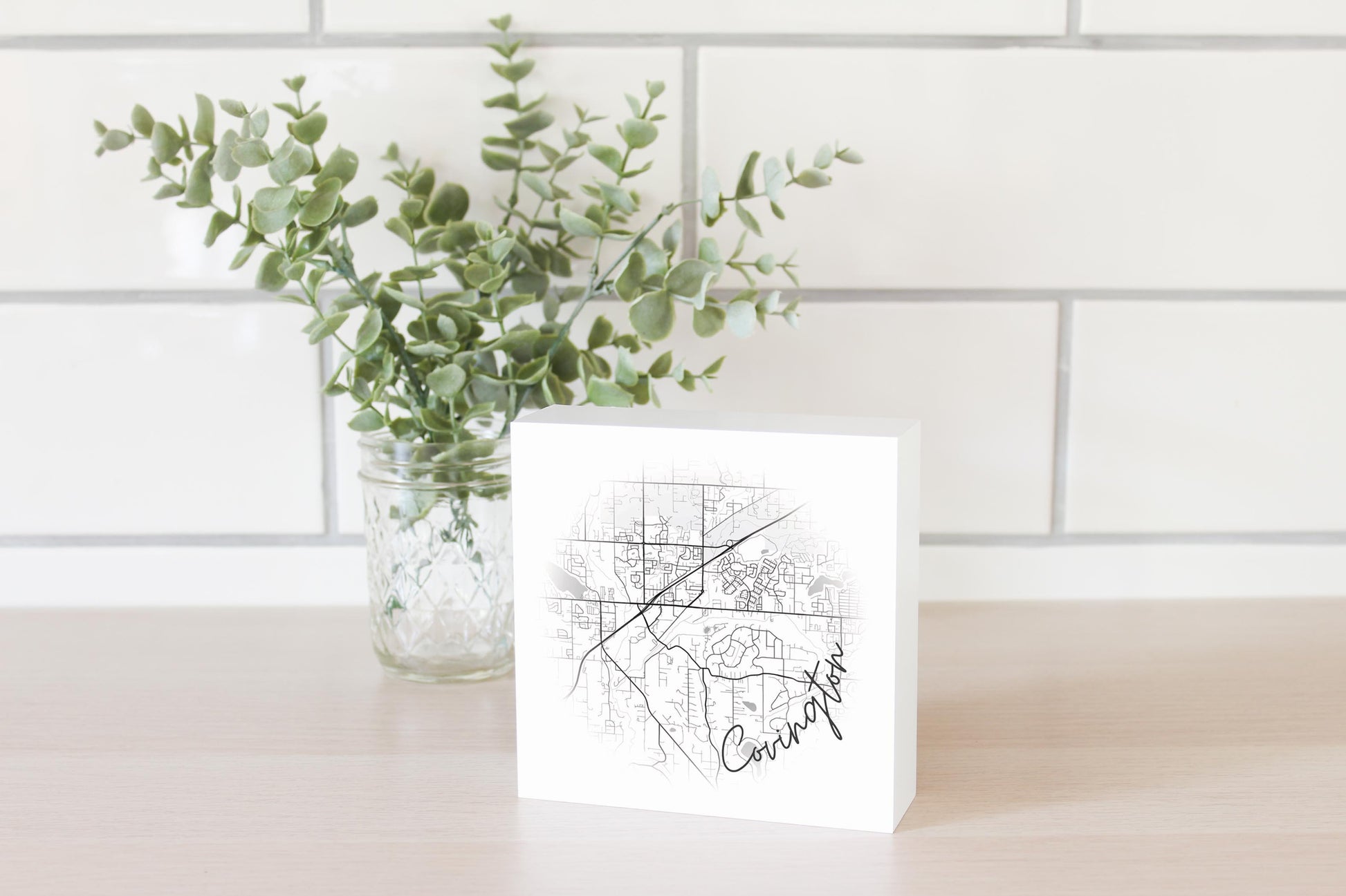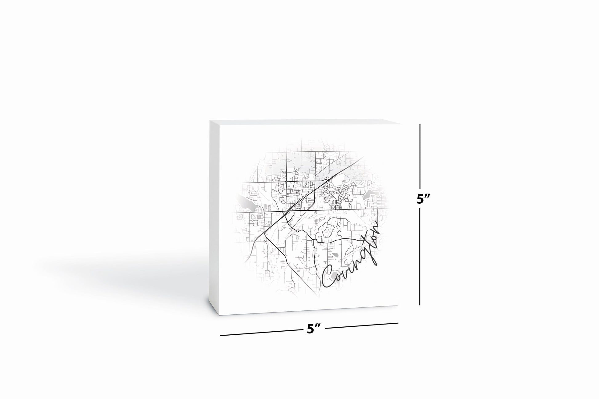 Minimalistic B&W Washington Covington Circle Map | Wood Block | Eaches | Min 4