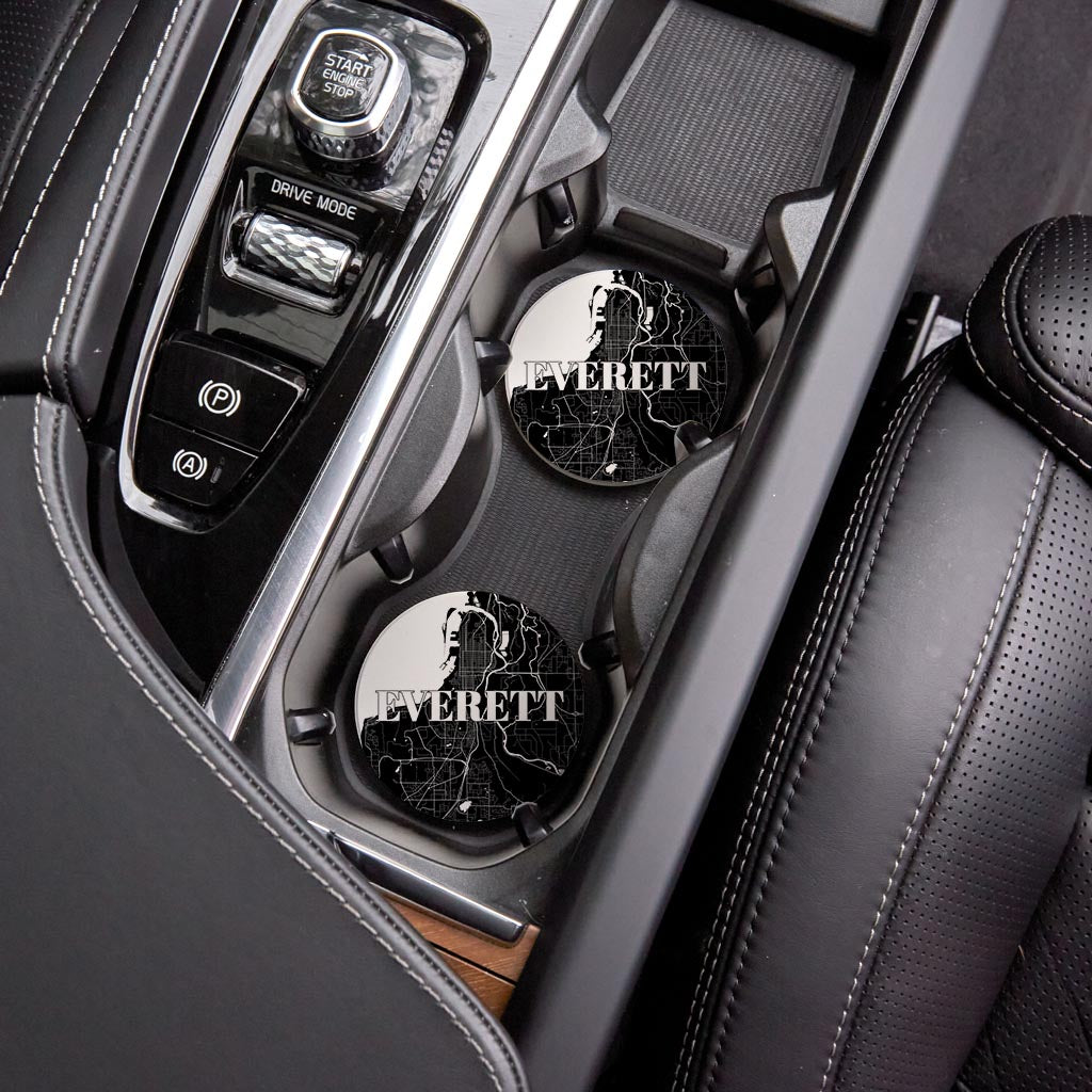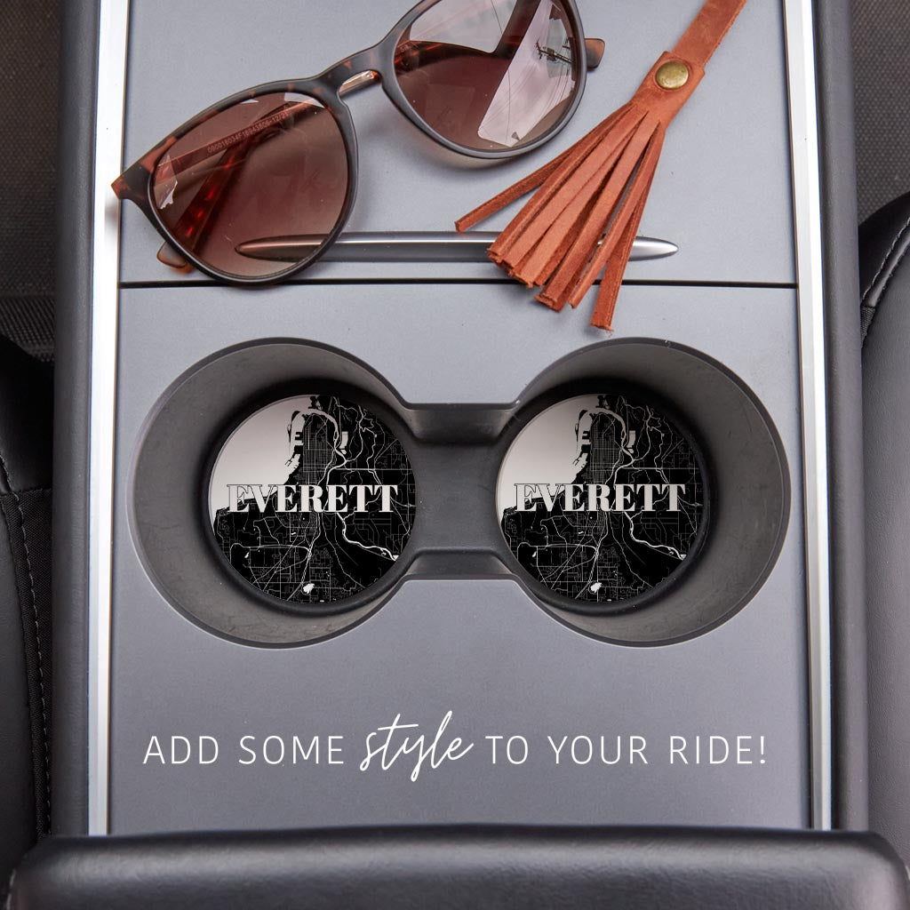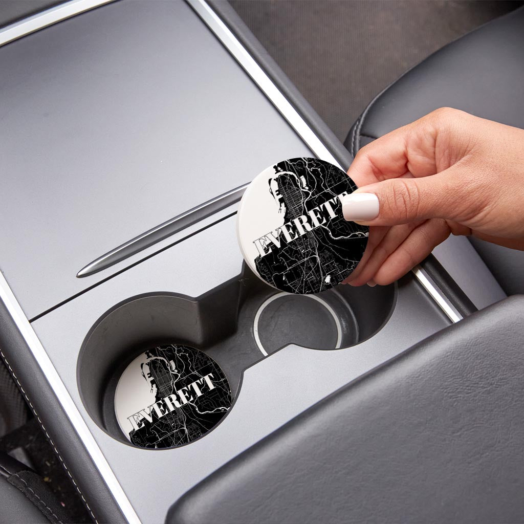 Minimalistic B&W Washington Everett Map | Absorbent Car Coasters | Set of 2 | Min 4