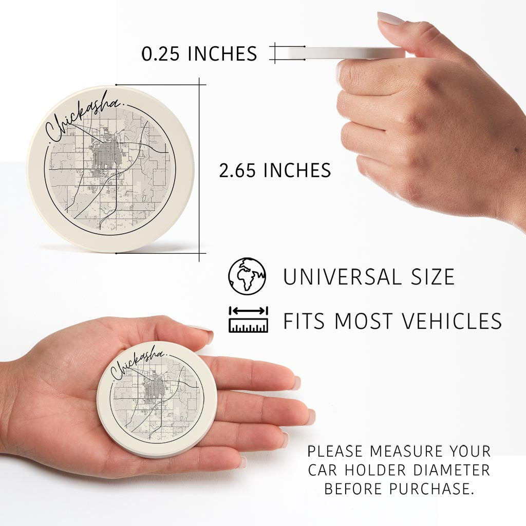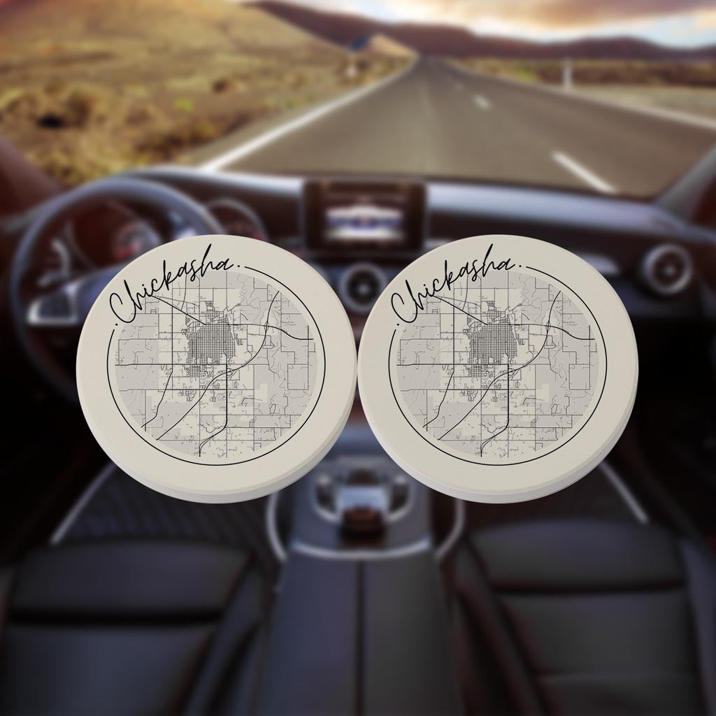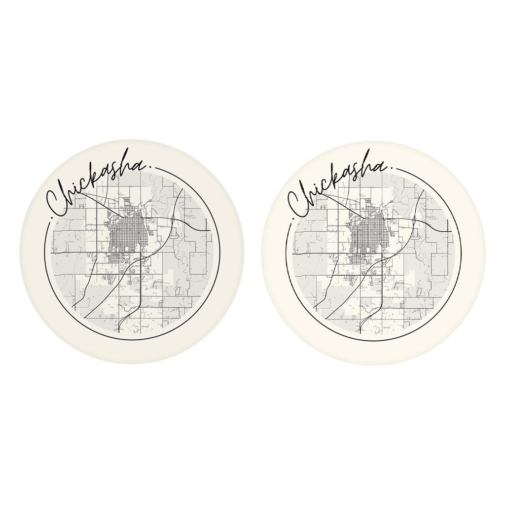 Modern Minimalist Oklahoma Chickasha Map | Absorbent Car Coasters | Set of 2 | Min 4