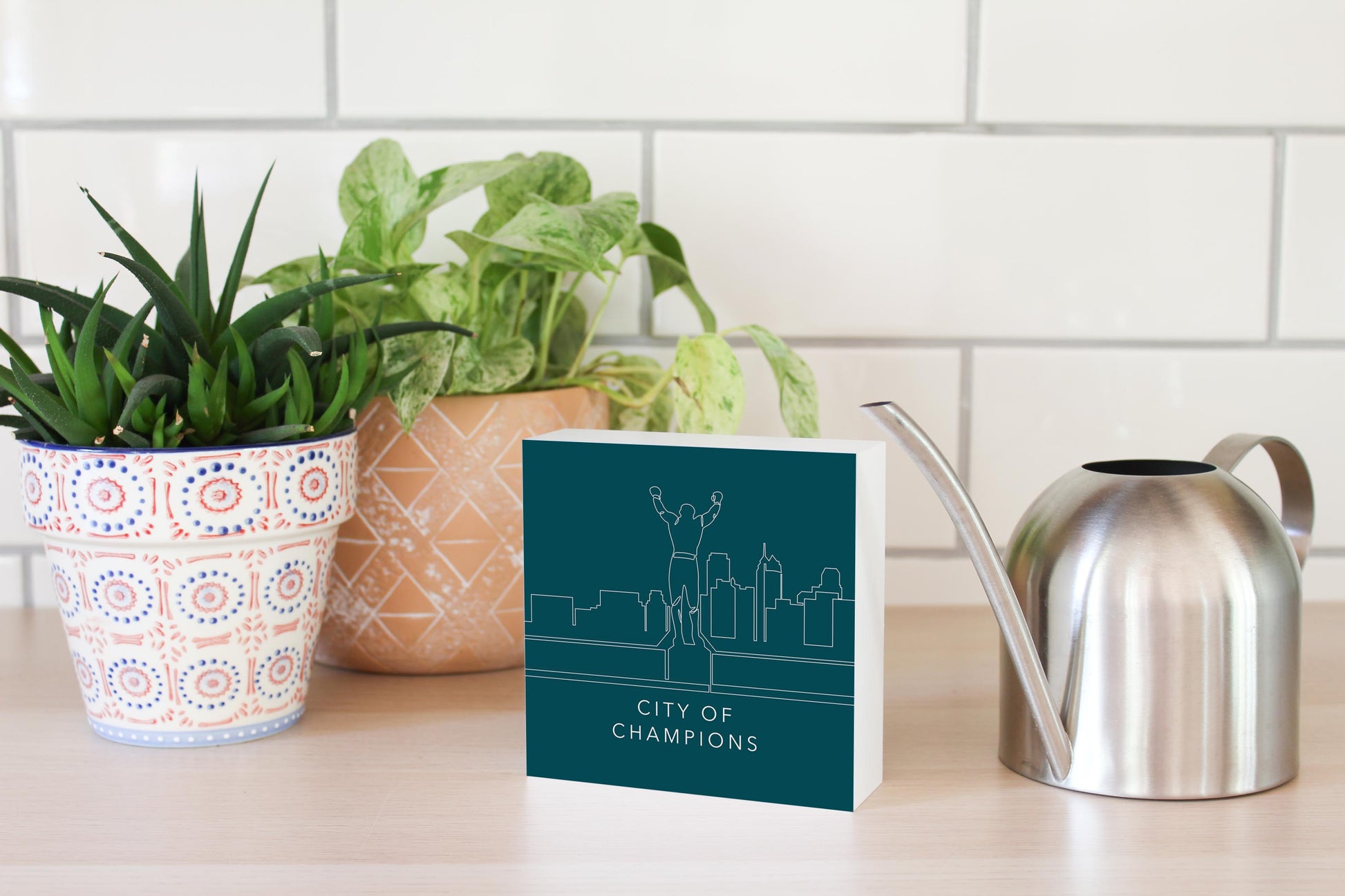 These wood block signs fit any setting! They require no hardware, and the hollow back design feely stands on its own or can be hung on the wall. Perfect for desks, mantels, counters, or shelves. The beautiful texture of the wood and vibrancy of ink are a great pairing. Our eco-friendly, water-based ink provides beautiful color and dimension, and all our wood blocks are made from upcycled compressed wood fiber. Printed and packaged in the USA. Express yourself!