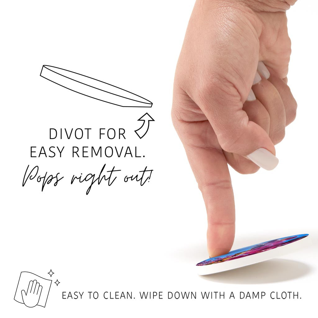 Car coasters are that little accessory that you didn’t know you needed but now consider an essential. Your cupholders are protected and kept clean by absorbing drips from your morning coffee to sticky juice boxes. The strategic divot edge allows you to easily pop it out and wipe clean. No more grime stuck in the cupholder abyss. While car coasters are wonderfully utilitarian, they also inject a little personality and design into the space you spend so much time in. Order a few to mix and match to your mood, season, or newest trends. We love when function and design coincide!