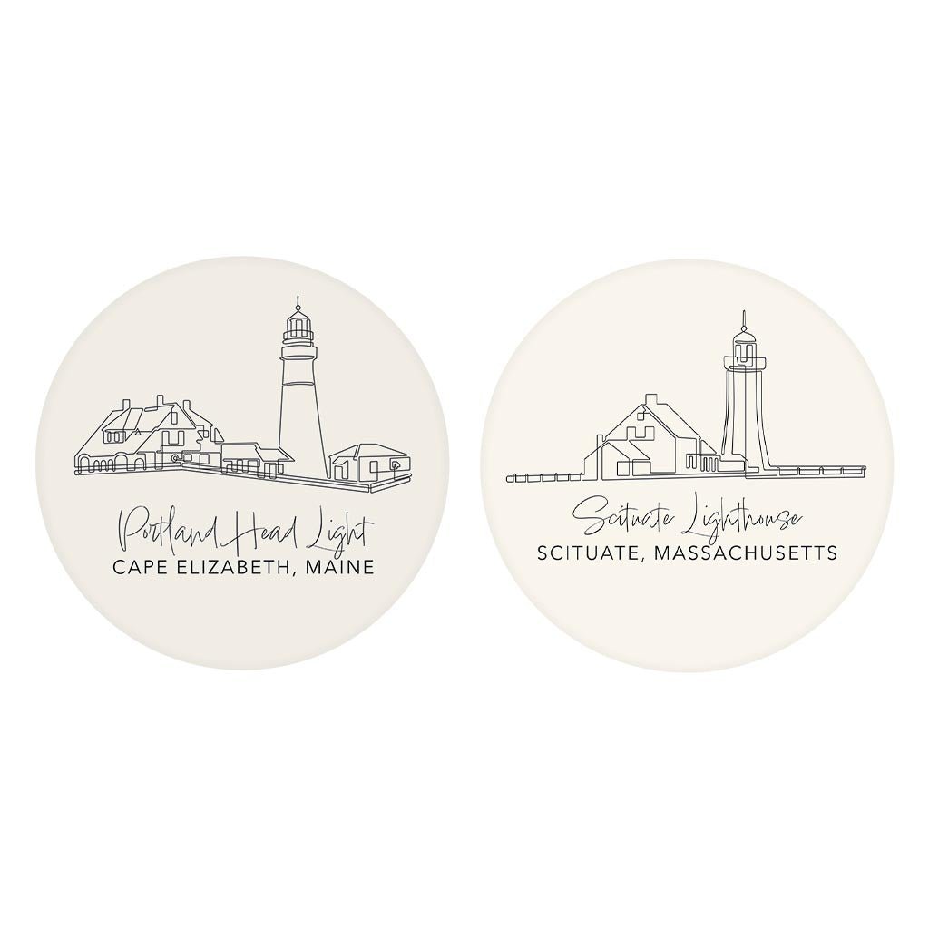 New England Lighthouses Cream Colored | Absorbent Car Coasters | Set of 2 | Min 4