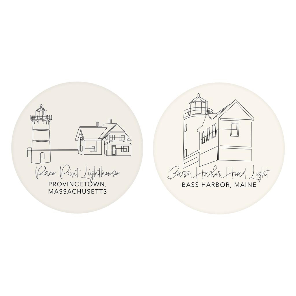 New England Lighthouses Cream Colored | Absorbent Car Coasters | Set of 2 | Min 4