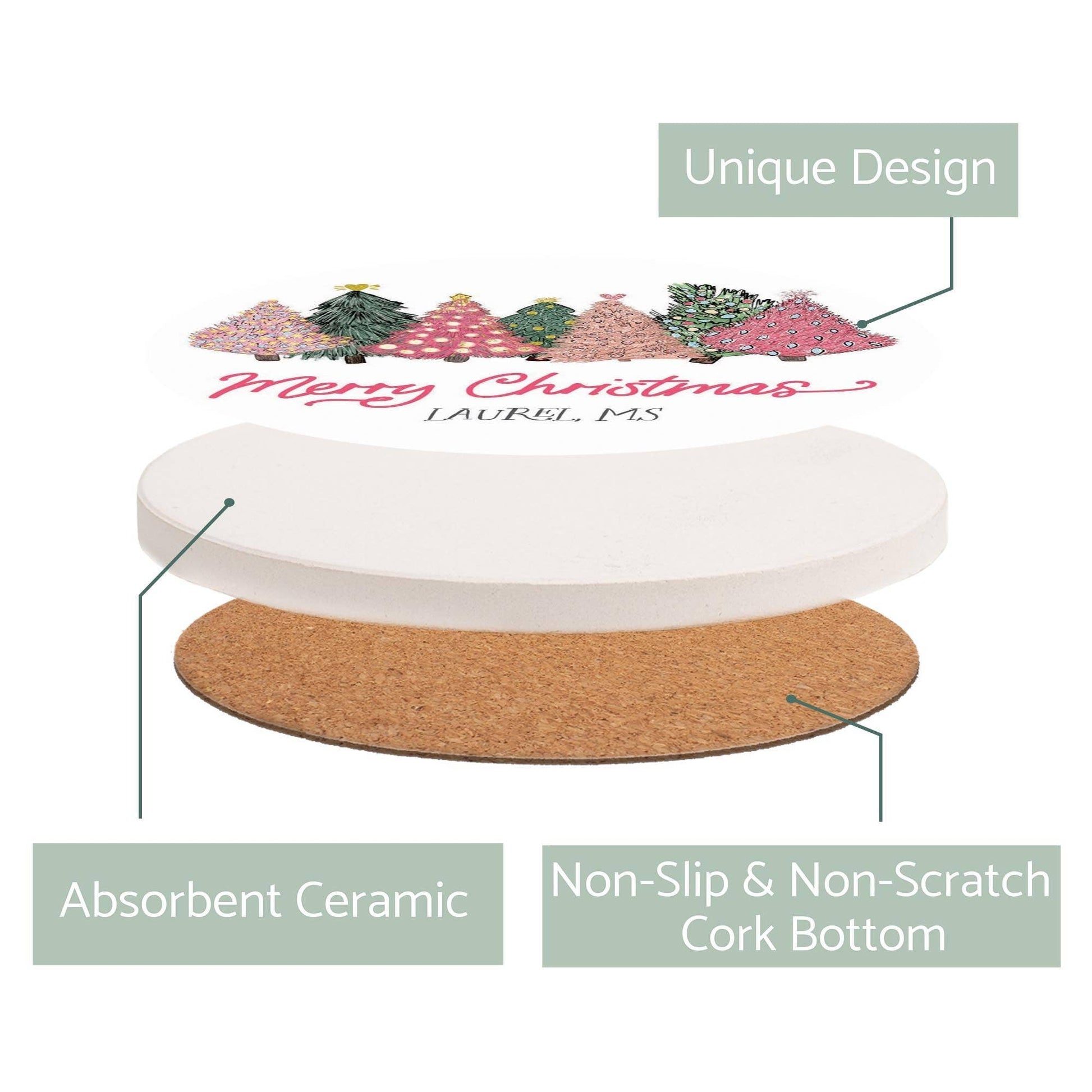 Measuring 4 inches in diameter, this absorbent ceramic coaster is designed to protect your surfaces while complementing your home decor. The eco-friendly cork backing ensures stability, keeping the coaster firmly in place while safeguarding tabletops from unsightly rings. Its colorful pink Christmas tree motif brings a whimsical element that resonates with the cozy charm of the season, making it a festive addition to any space.