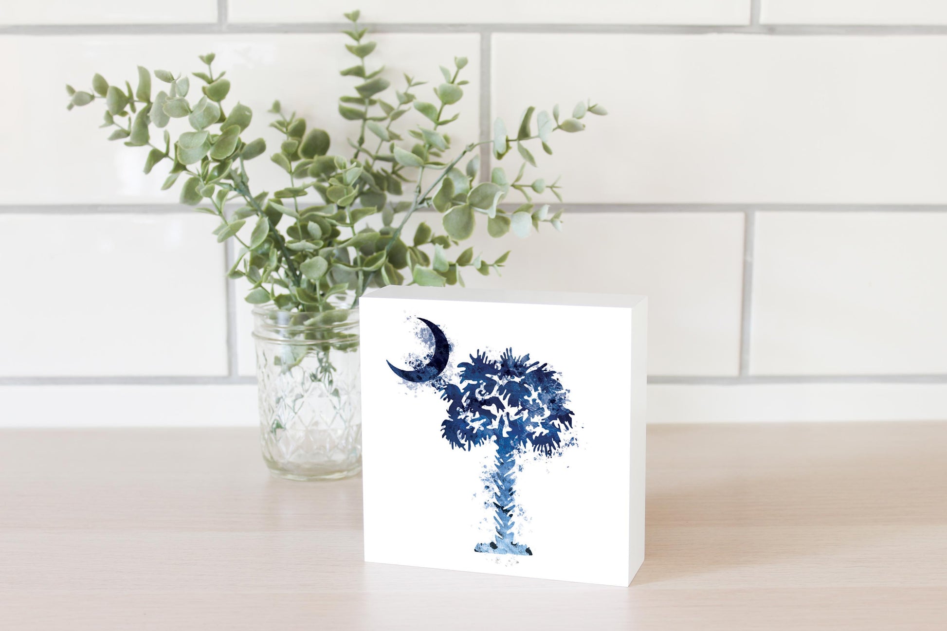 South Carolina Blue Water Color Palm Trees On White | Wood Block | Eaches | Min 4