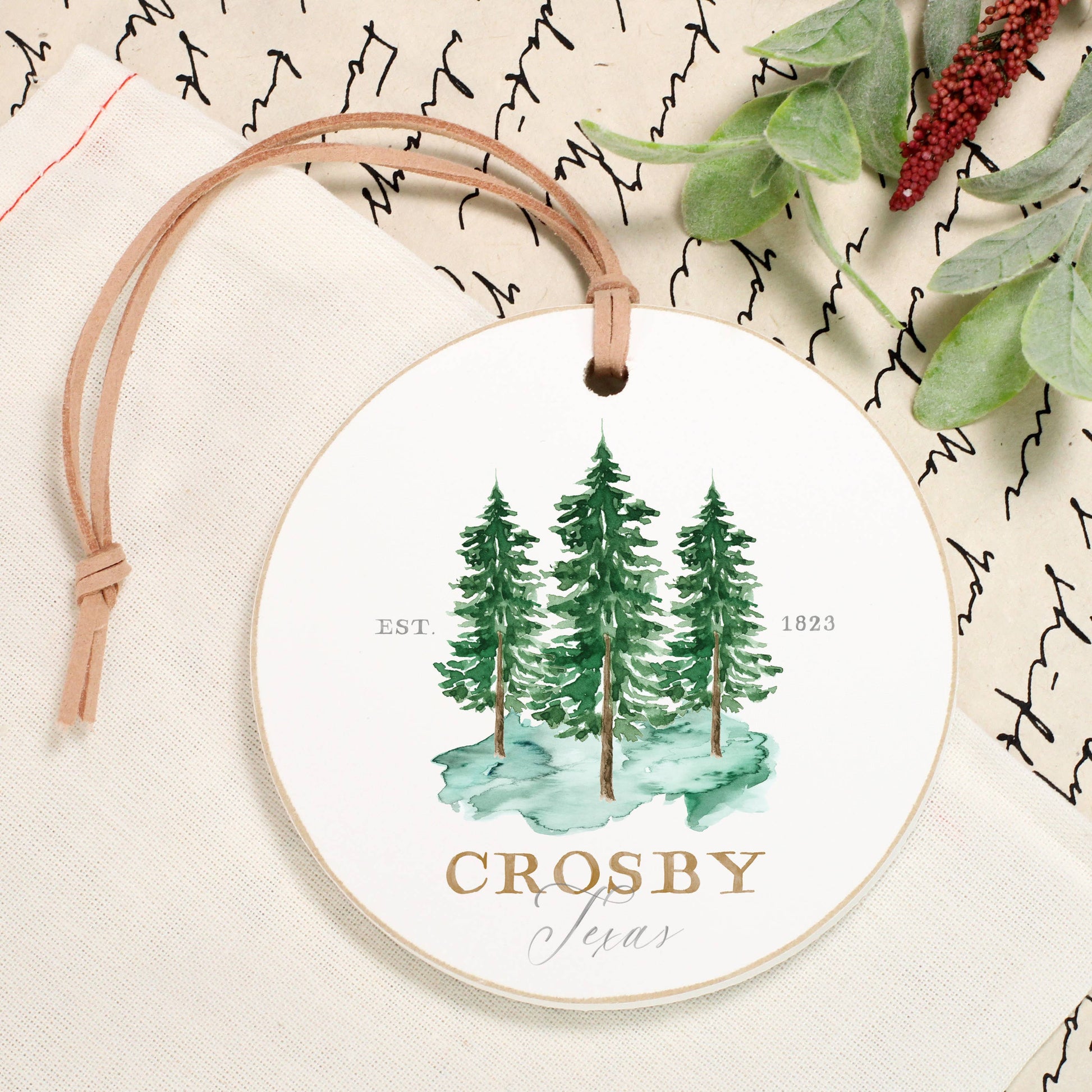 Each ornament is lovingly handmade from real wood, ensuring that no two pieces are alike. The intricate watercolor artwork portrays a trio of trees, evoking a sense of tranquility and connection to nature. The natural materials provide a rustic feel, making it not just a seasonal decoration but a year-round piece that speaks to the heart of our small-town pride.